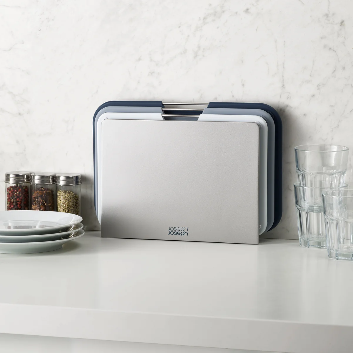 Das Nest Board Schneidebrettset mit Aufbewahrungsständer von Joseph Joseph ist platzsparend und praktisch. Das Set besteht aus drei Schneidebrettern in verschiedenen Farben und einem schlanken Aufbewahrungsstand. Die Schneidebretter aus Kunststoff haben unterschiedliche Größen und dienen damit für eine Reihe von Zubereitungsmöglichkeiten. Sie verfügen über einen Edelstahlgriff, eine rutschfeste Unterseite und eine messerfreundliche Schneidefläche. Der Aufbewahrungsständer lässt Platz zwischen den einzelnen Schneidebrettchen und sorgt so für Luftzirkulation nach dem Reinigen.