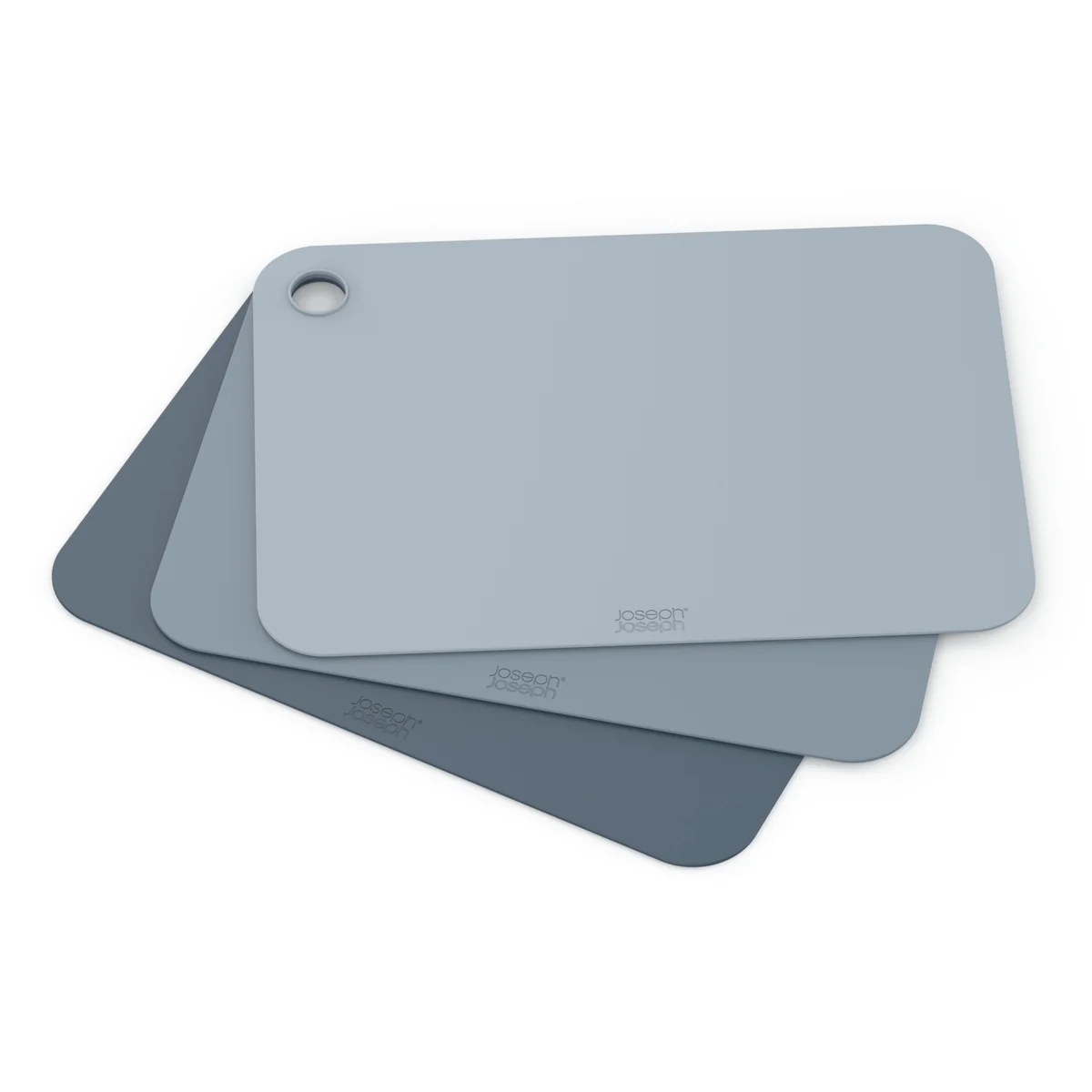 Jedes Teil des dreiteiligen Pop Pop Schneidebrett-Set ist beidseitig verwendbar und farbkodiert: Dies erlaubt eine Zuordnung der einzelnen Matten zu verschiedenen Lebensmitteln und minimiert die Wahrscheinlichkeit einer übergreifenden Verunreinigung (Kreuzkontamination). Die flexiblen Schneidebretter von Joseph Joseph können ganz einfach gebogen werden, um kleingeschnittene Lebensmittel in die Pfanne oder den Topf gleiten zu lassen. Darüber hinaus ist die flexible Oberfläche eine schonende Schneidunterlage - nicht nur für Arbeitsflächen und Tische, sondern vor allem auch für Messerklingen.