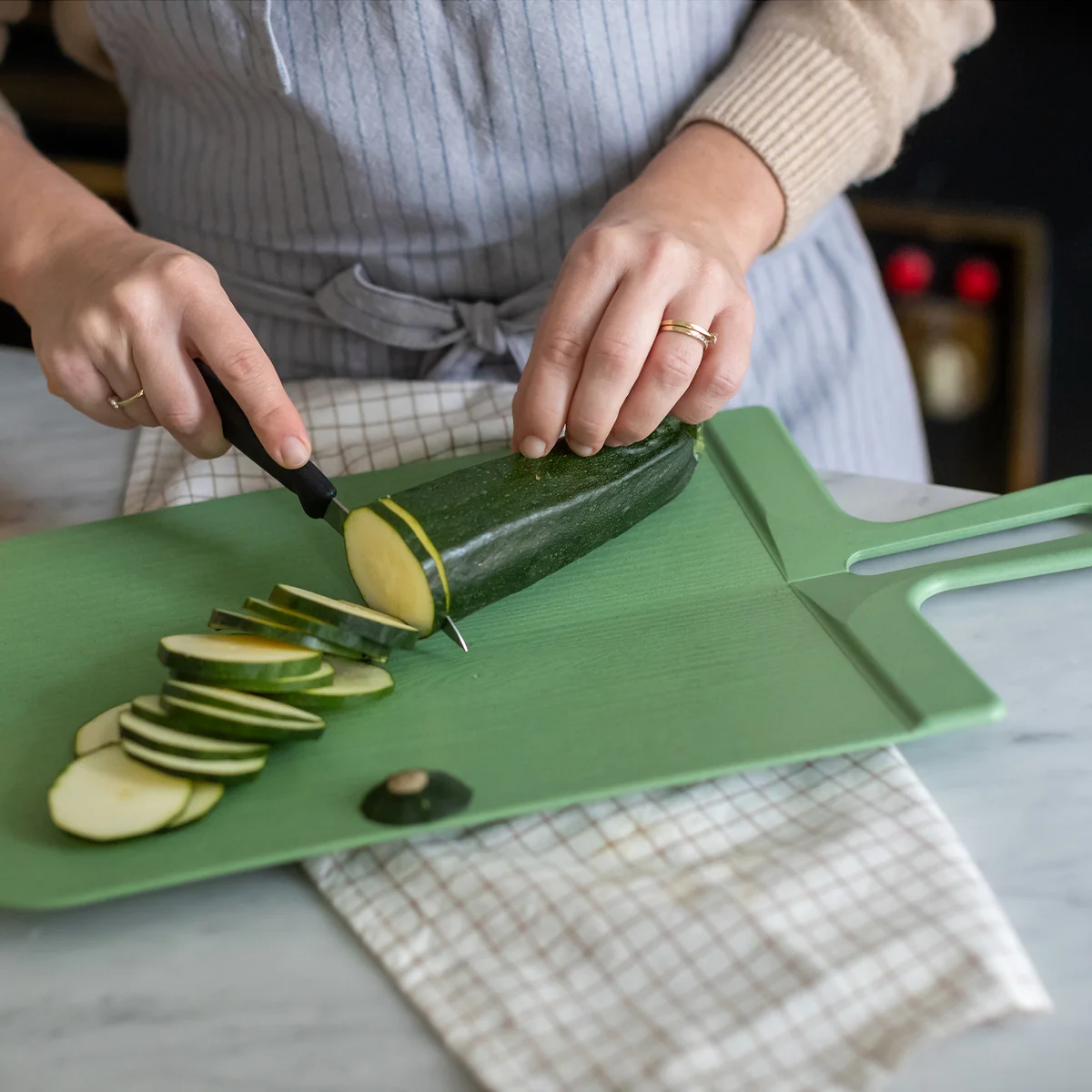 An dem länglichen Griff lässt sich Snap bequem greifen. Durch leichten Druck am Griff faltet sich das Schneidebrett zusammen. In der entstehenden V-Form sammeln sich die geschnittenen Nahrungsmittel und können gezielt in den Topf, die Pfanne oder die Schüssel gegeben werden, ohne dass etwas daneben fällt.