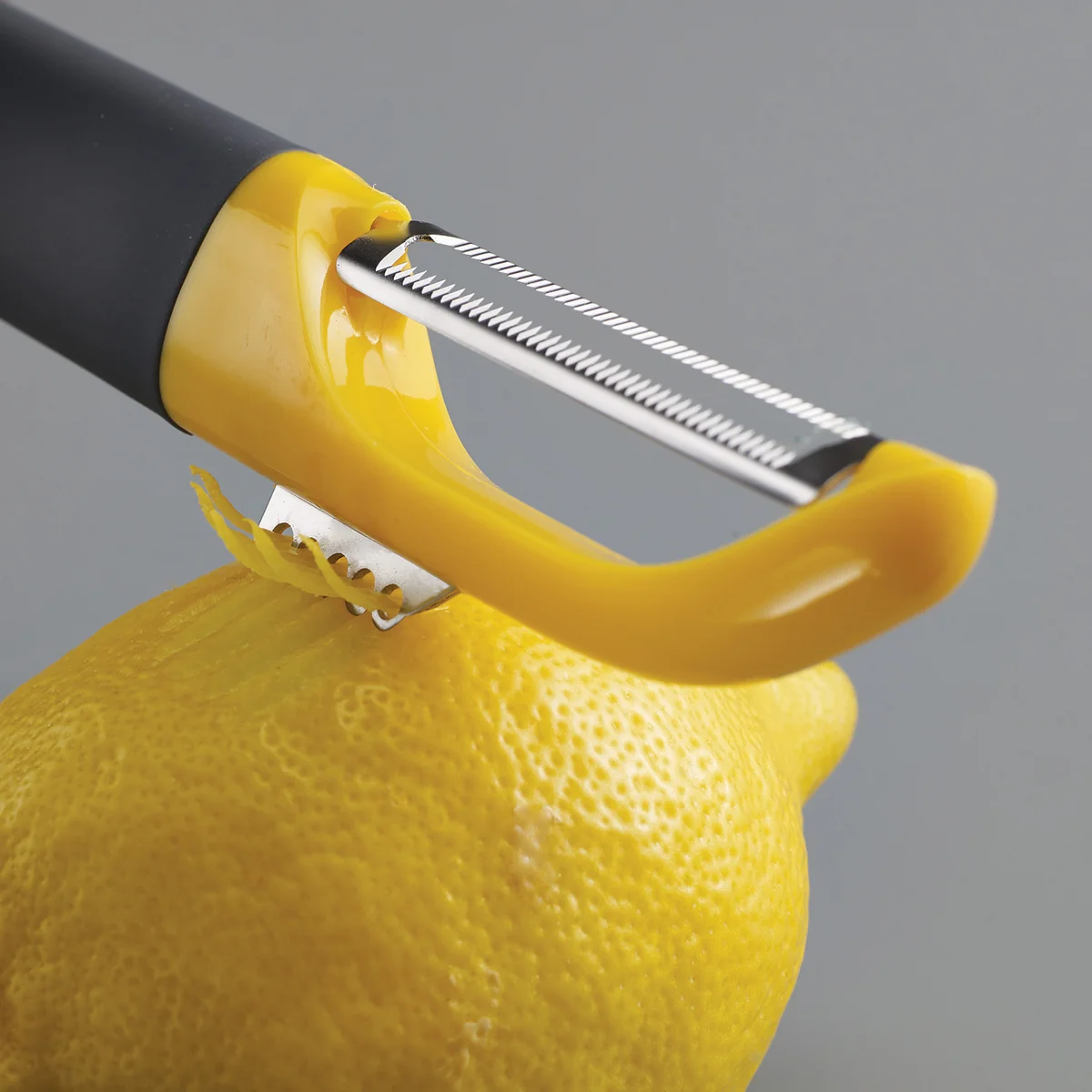 Die Klinge des Multi Peel „Serrated Peeler“ ist der optimale Helfer beim Schälen von Obst. Der gezackte Schäler schabt mühelos die Schale von Zitrusfrüchten, sodass Kuchen und Desserts besonders fruchtig werden. Der integrierte Zestenreißer ermöglicht feine Streifen der Haut von Zitrusfrüchten abzutrennen, die für Raffinesse in Gerichten und beim Garnieren sorgen.