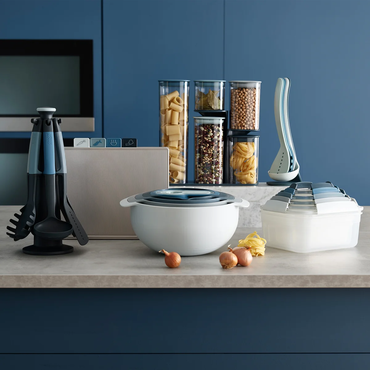 Das innovative Design des Nest 9 Plus Küchensets ermöglicht das einfache Ineinanderstapeln der einzelnen Elemente. Dank der Farbpalette sieht das Küchenset von Joseph Joseph in diesem Zustand auch noch fantastisch aus. So haben Sie viele Küchenhelfer, die aber nur wenig Platz benötigen. Natürlich lässt sich das Joseph Joseph Nest 9 Plus Küchenset in der Spülmaschine reinigen.