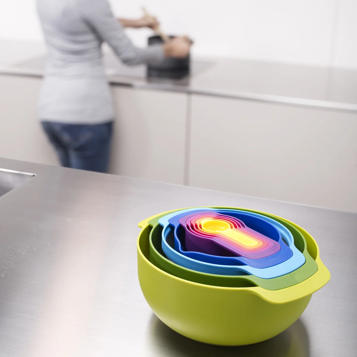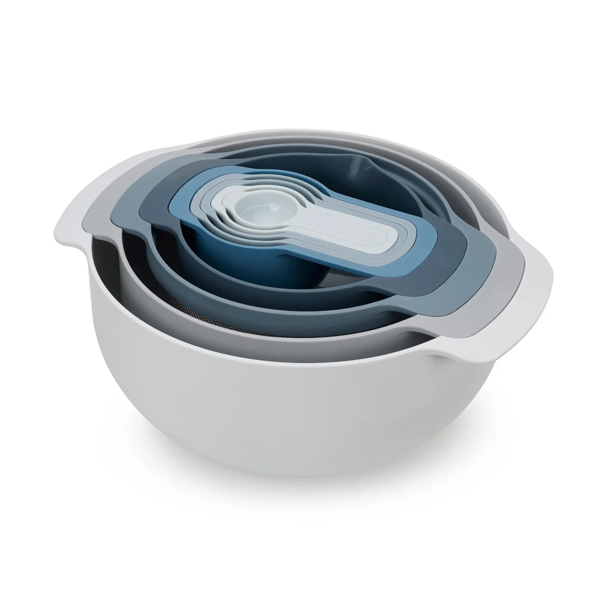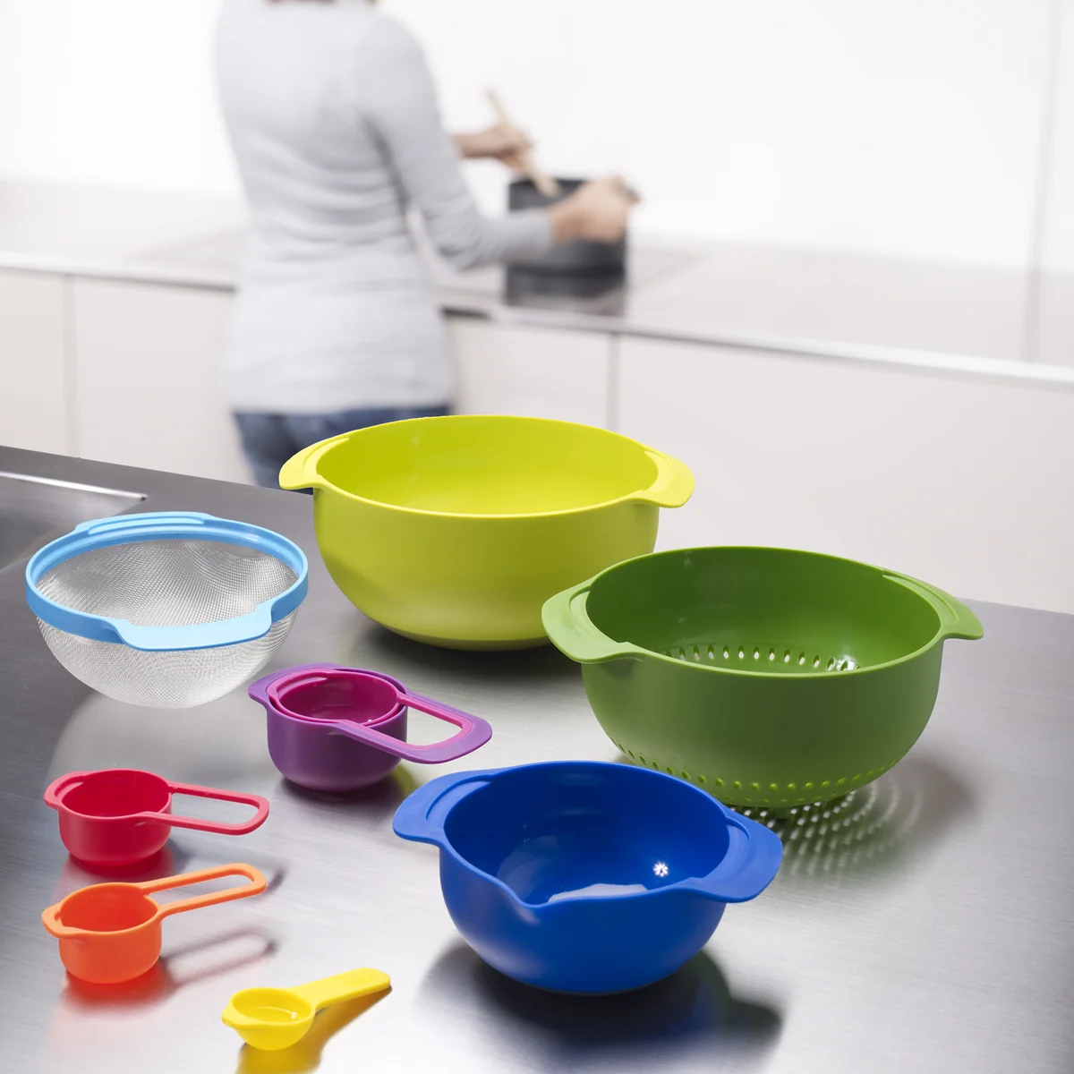 Das Joseph Joseph Nest 9 Plus ist die ultimative Zusammenstellung von Küchenhelfern. Mit fünf Messbechern, zwei Rührschüsseln, einem Filtersieb und einem Abtropfsieb lässt sich einfach alles zubereiten.