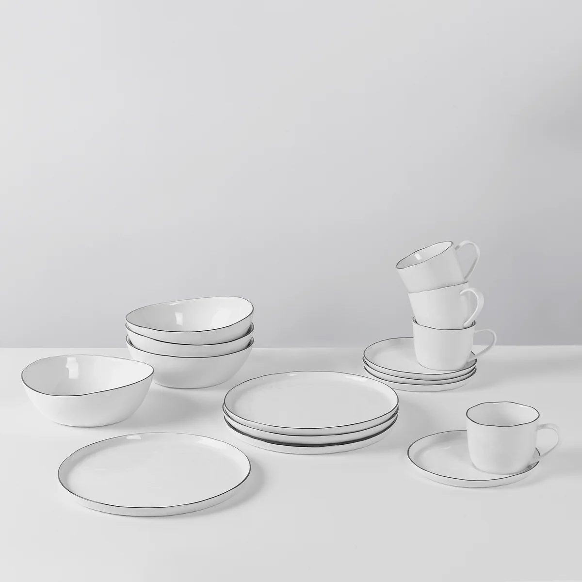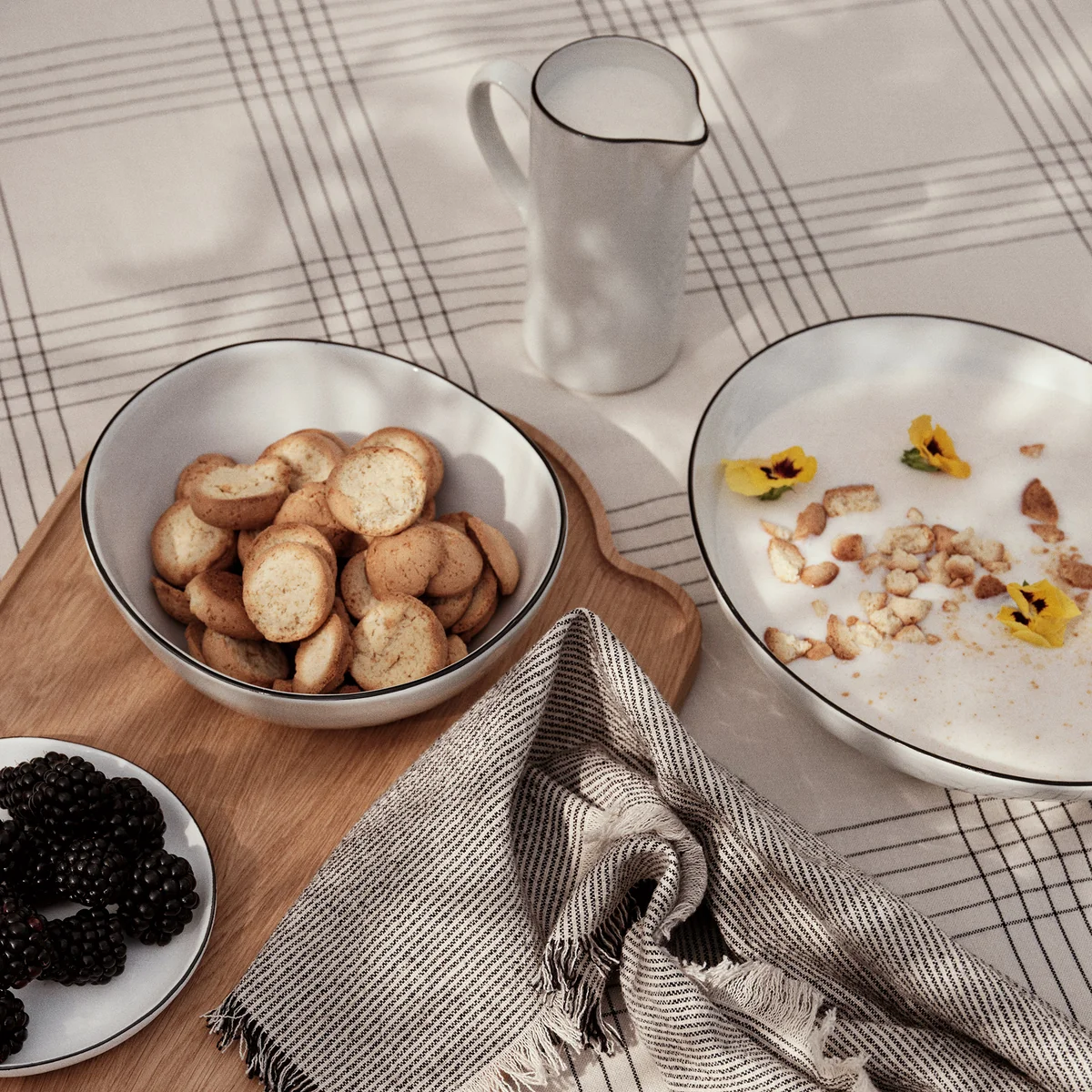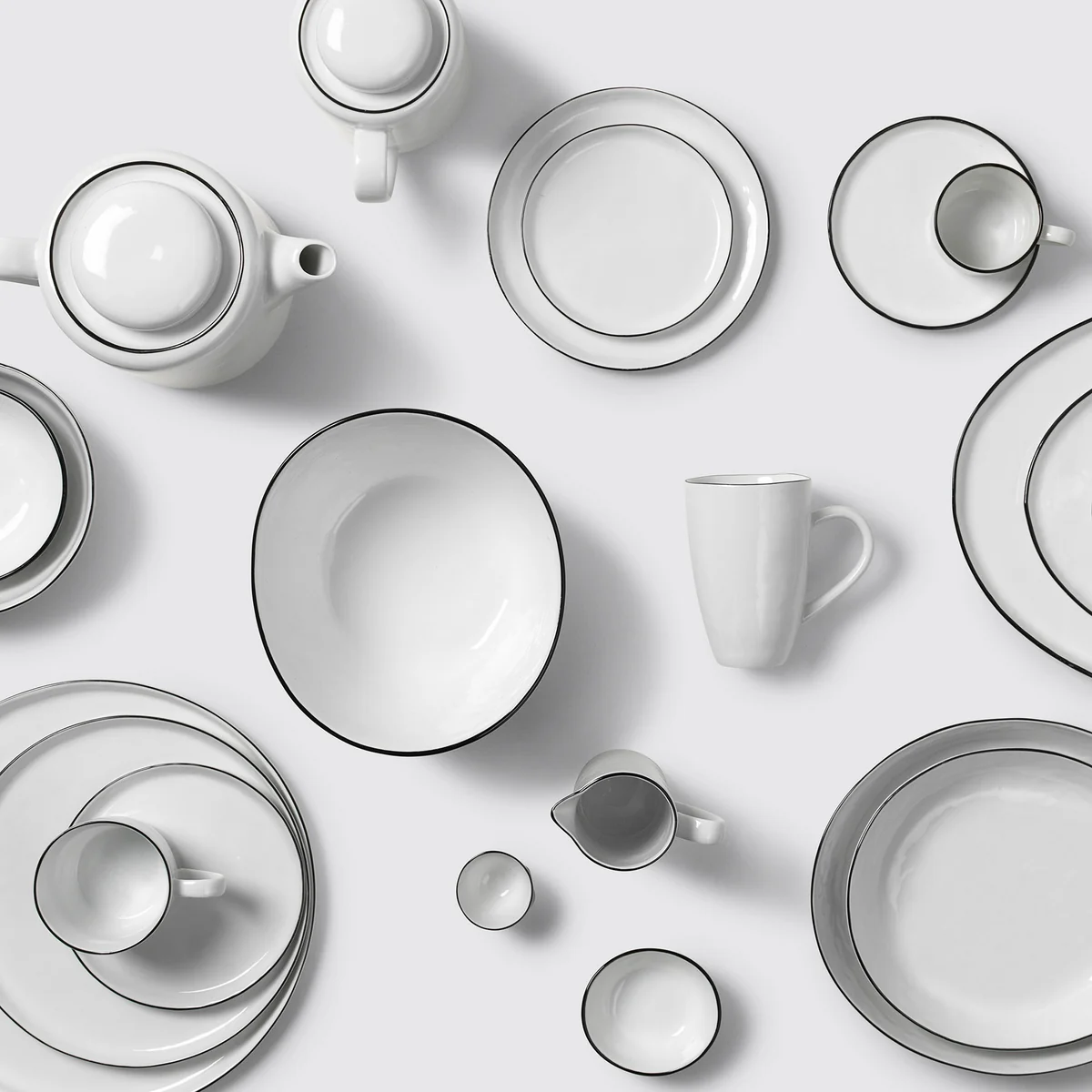 Aus der Salt Schale von Broste Copenhagen lässt sich das morgendliche Müsli, eine warme Suppe oder ein frischer Salat stilvoll genießen. Die Schale ist Teil der Salt Kollektion und zeichnet sich durch klassische Formen mit Eleganz und Schärfe aus. Die weiße Glasur wird durch handbemalte schwarze Ränder ergänzt. Die Glasur erhält im Brennprozess ihre unverwechselbare Textur und Farbe, die jedes Geschirrstück einzigartig macht.