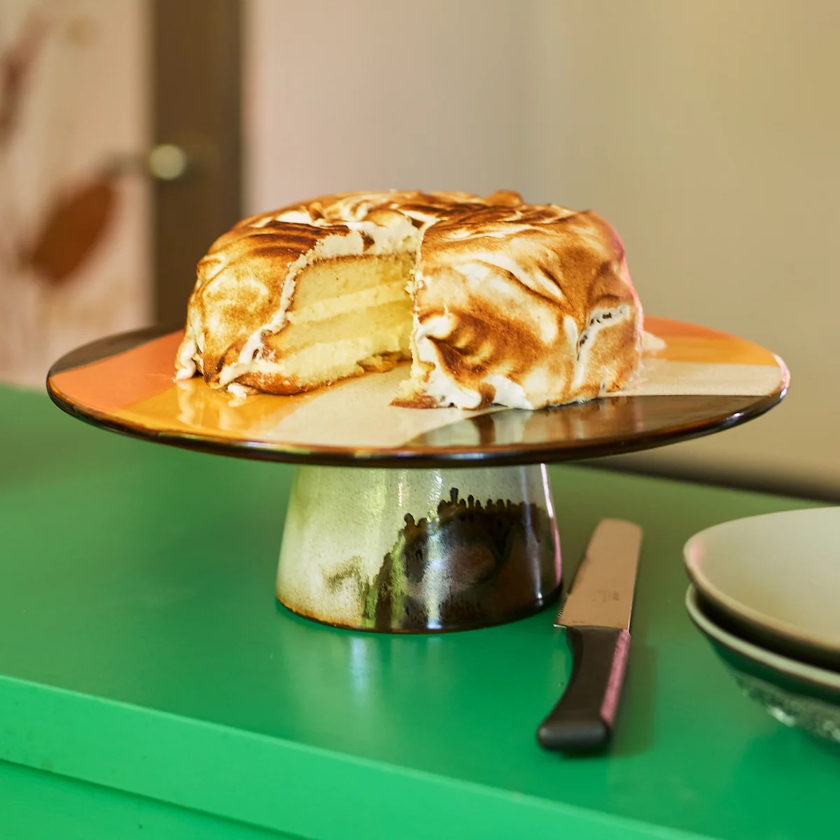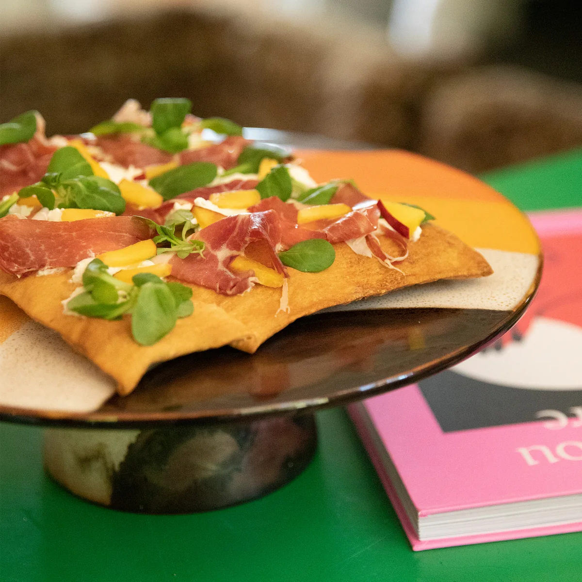Die 70's Schale mit Fuß von HKliving verdient einen ganz besonderen Platz auf der Küchentheke. Mit einem besonderen Design, das unterschiedliche Farben ineinanderlaufen lässt und einer besonderen reaktiven Glasur, kommt das hochwertige Steingut gut zum Vorschein.
