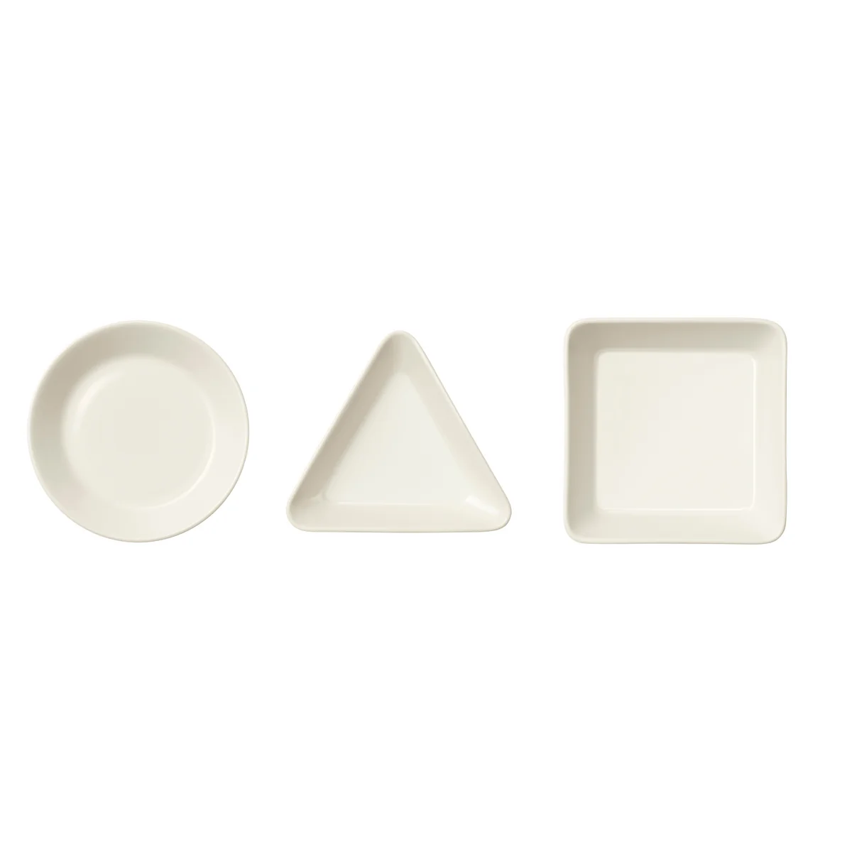 Jedes Teema Servierset besteht aus drei Teilen: einer kreisförmigen, einer dreieckigen und einer viereckigen Servierschale. Die runde Schale beruht auf Kaj Francks Originalentwurf für die Untertasse der Teema Kaffeetasse. Die dreieckigen und viereckigen Schalen sind neue Entwürfe von Heikki Orvola und basieren auf den alten Entwürfen von Franck.