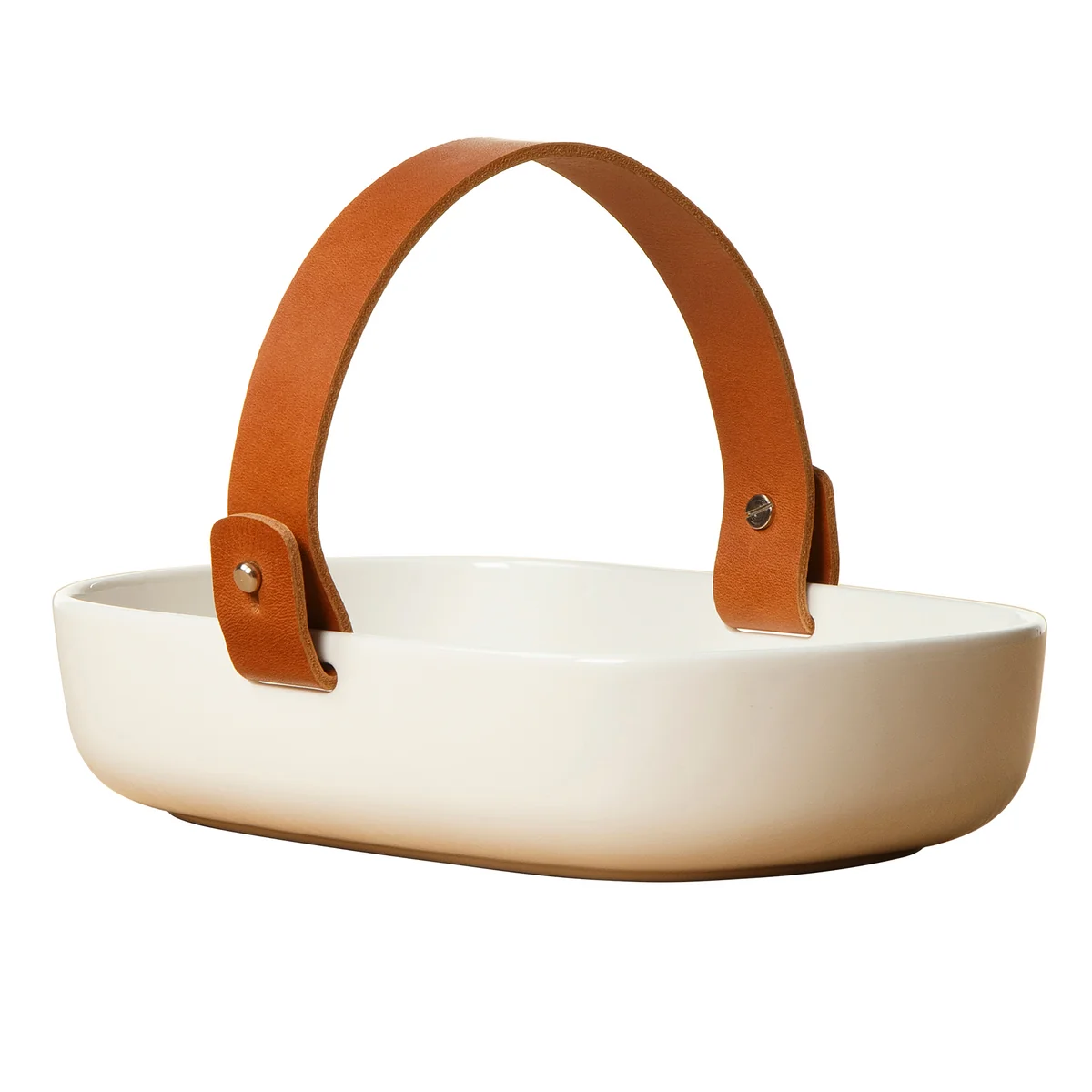 Die Servierschale mit Ledergriff wird aus glasiertem Steinzeug hergestellt und ist spülmaschinenfest. Der Griff besteht aus Leder und sollte, bevor die Schale in die Spülmaschine gestellt wird, abgenommen werden.