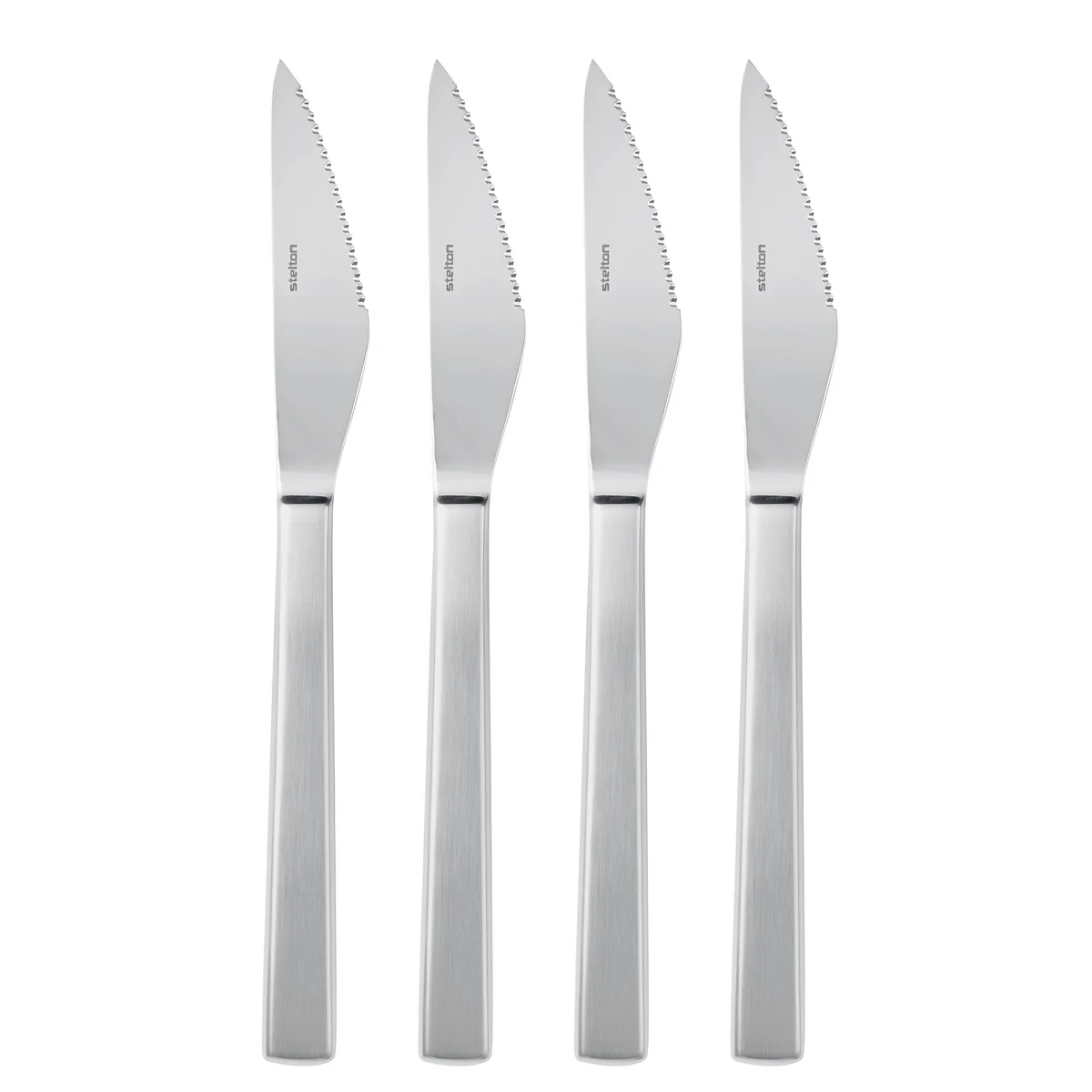 Das Maya Steakmesser des Labels Stelton ist die perfekte Ergänzung für das heimische Tafelbesteck. Das Steakmesser hat - wie auch der Rest der Maya-Serie des Designers Tias Eckhoff - eine charakteristische Dreiecksform. Das Messer liegt überaus angenehm in der Hand und wirkt optisch zudem äußerst zeitlos und ansprechend. Der scharfe Wellenschliff des Steakmessers ermöglicht das Schneiden von gegrilltem Fleisch oder Gemüse. Besonders in Kombination mit weiteren Teilen der Maya-Serie entsteht ein einheitliches Bild. Das Steakmesser ist im 4er-Set erhältlich.