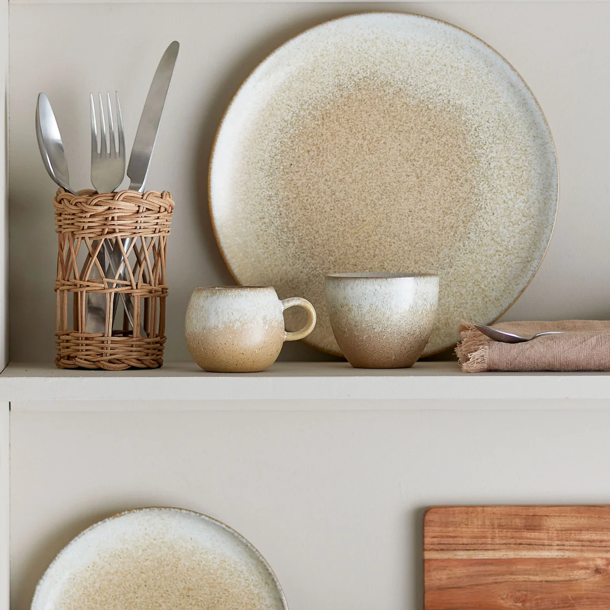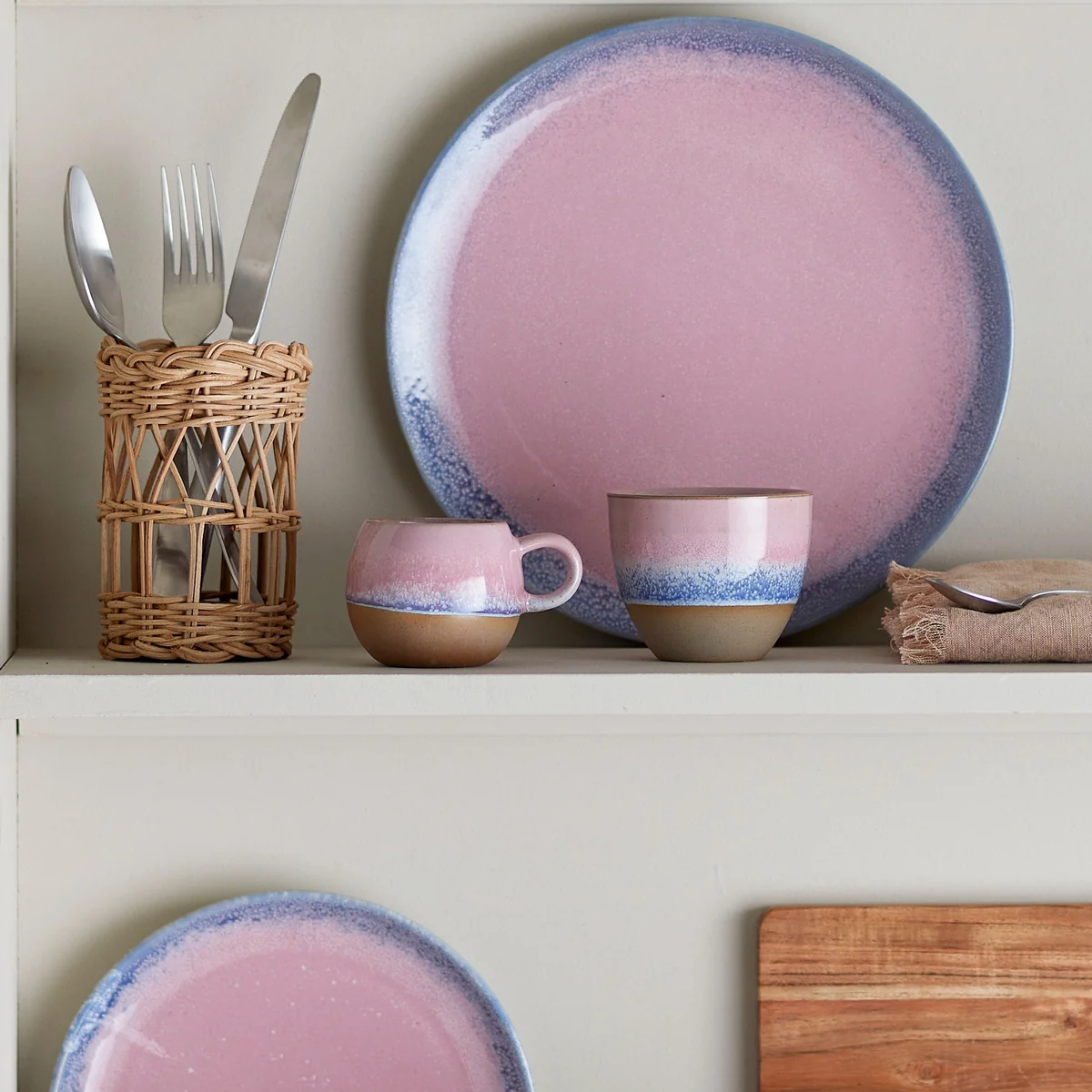 - Hochwertiges Steinzeug mit zarter Glasur in Orange- und Rosatönen