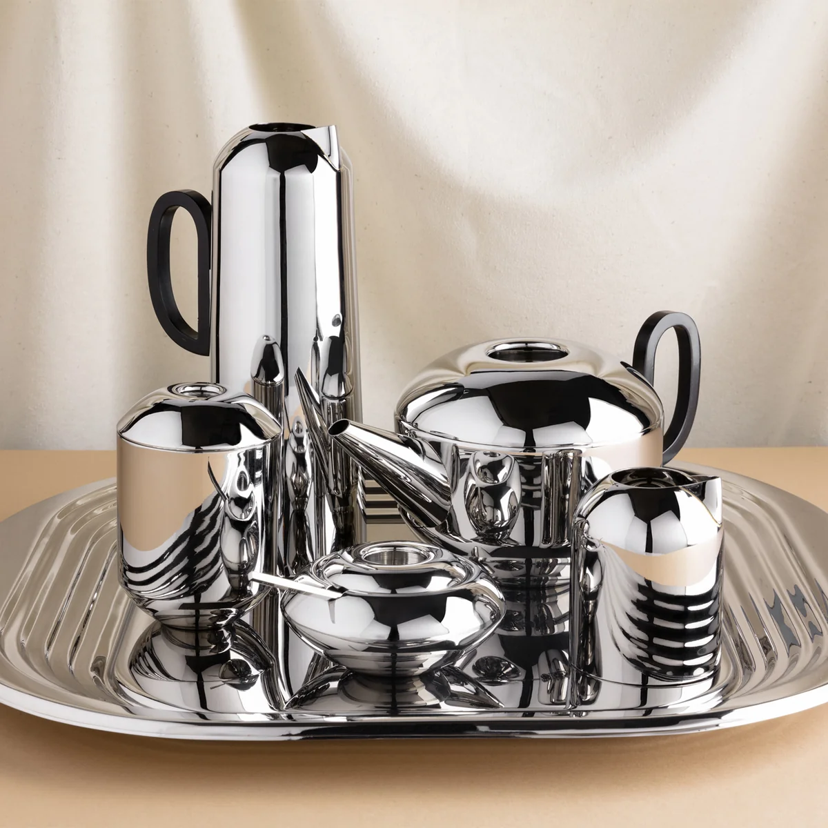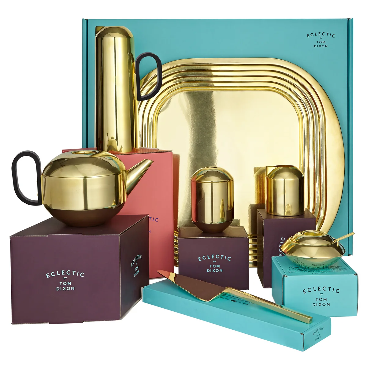Zu der Form Serie gehören außerdem ein Tortenheber und eine Karaffe, ein Milch- und Zuckerset, ein Tablett und Schalen in verschiedenen Größen. Jedes einzelne Produkt aus der Serie wird aus Messing oder Edelstahl hergestellt, veredelt den gedeckten Tisch und bringt ein wenig Glamour in den Wohnbereich. Die Form Bowl Tall Schalen sind die einzigen, die aus Kupfer hergestellt werden.