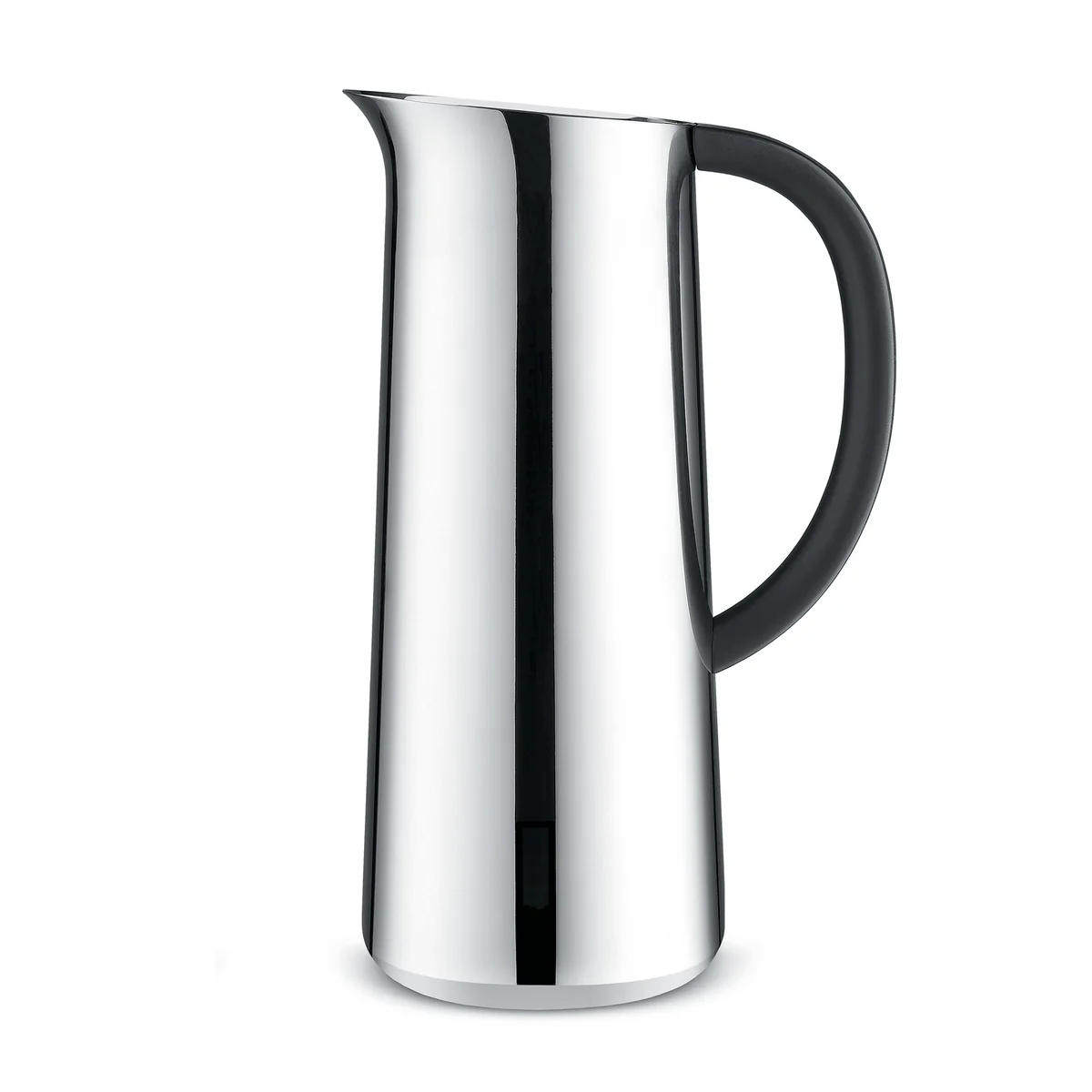 Die Nomu Isolierkanne von Naoto Fukasawa für Alessi ist eine Edelstahlkanne zum Servieren von Kalt- und Heißgetränken. Anstatt eines Deckels besitzt die Kanne einen Ausguss und einen schwarzen Henkel. Auf der Arbeit oder zuhause auf dem Esstisch glänzt die Isolierkanne mit ihrem edlen, aber dennoch schlichten Design.
