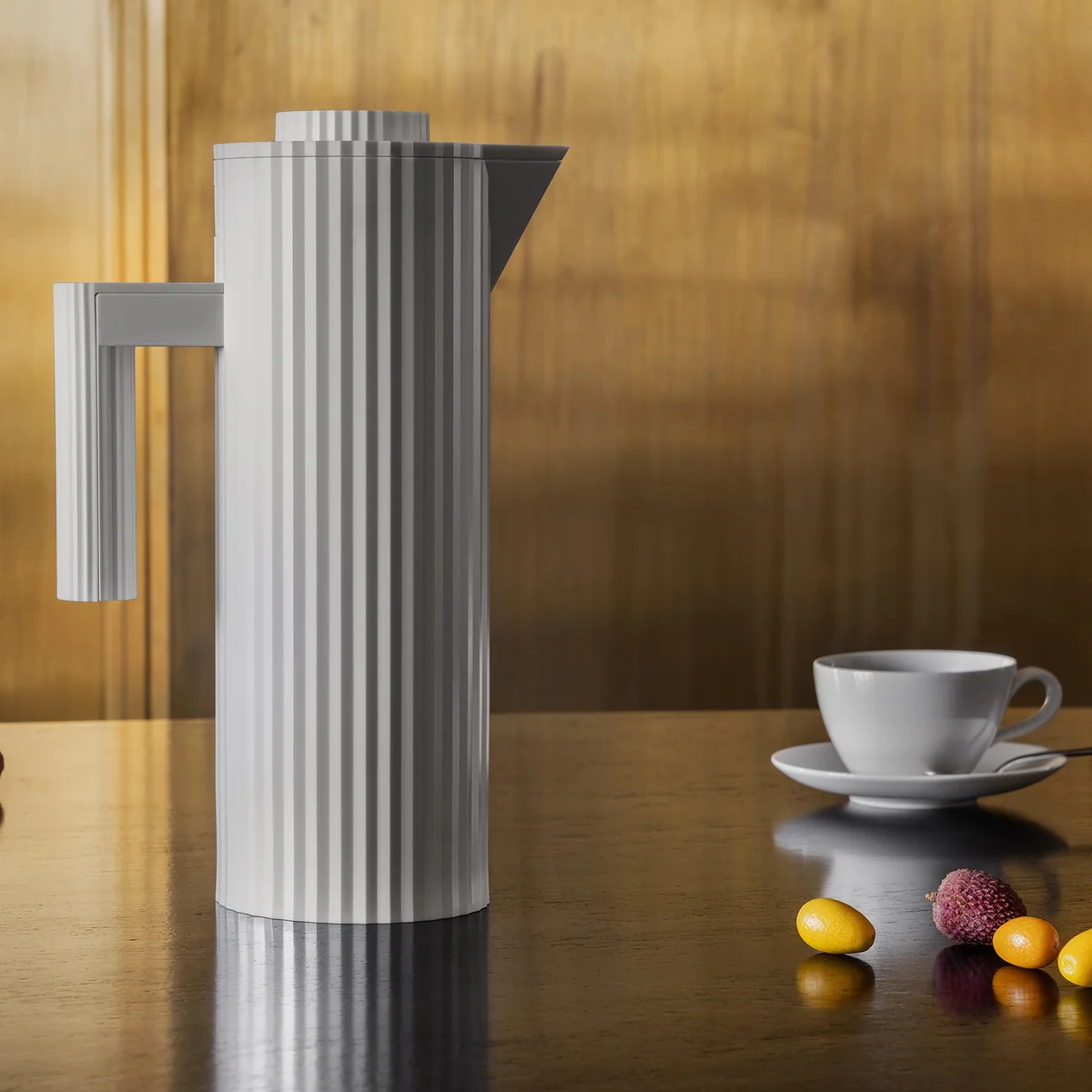 Die Ausstrahlung und Form der Plissé Isolierkanne machen sie absolut unverwechselbar. Sie besteht aus einem Korpus mit Deckel aus thermoplastischem Harz und einem doppelwandigen Innenbehälter aus Thermoglas. Der Deckel verfügt über einen Edelstahlknopf zum Öffnen und Verschließen. Am Korpus befindet sich ein versenkbarer Knopf oberhalb des Griffs, der die Karaffe öffnet und die Entnahme des Innenbehälters ermöglicht.
