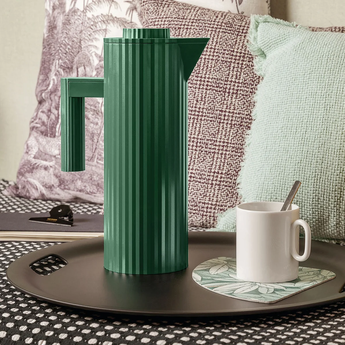 Die Ausstrahlung und Form der Plissé Isolierkanne machen sie absolut unverwechselbar. Sie besteht aus einem Korpus mit Deckel aus thermoplastischem Harz und einem doppelwandigen Innenbehälter aus Thermoglas. Der Deckel verfügt über einen Edelstahlknopf zum Öffnen und Verschließen. Am Korpus befindet sich ein versenkbarer Knopf oberhalb des Griffs, der die Karaffe öffnet und die Entnahme des Innenbehälters ermöglicht.
