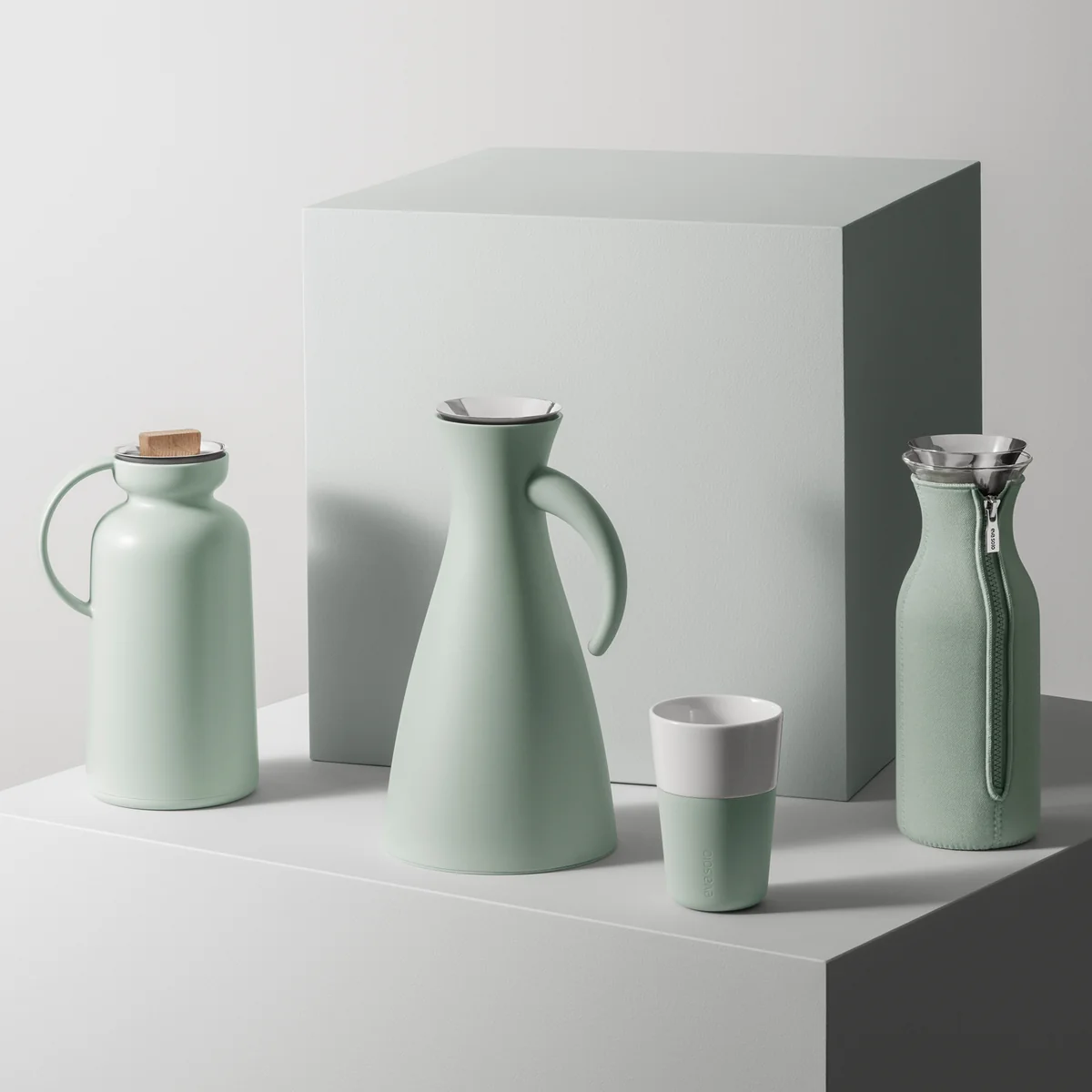 Die preisgekrönte Isolierkannenserie von Eva Solo besteht außen aus Kunststoff und ist innen mit einem austauschbaren Glaskolben ausgestattet. Sowohl die hohen als auch die niedrigen Varianten haben ein Fassungsvermögen von 1,0 l und sind in verschiedenen Farben erhältlich.