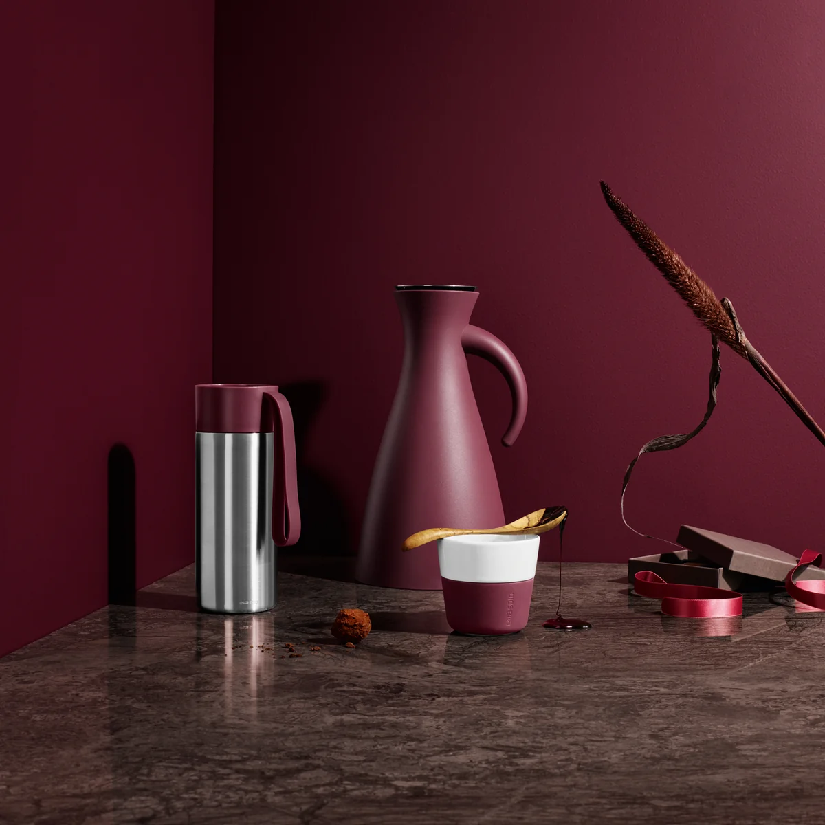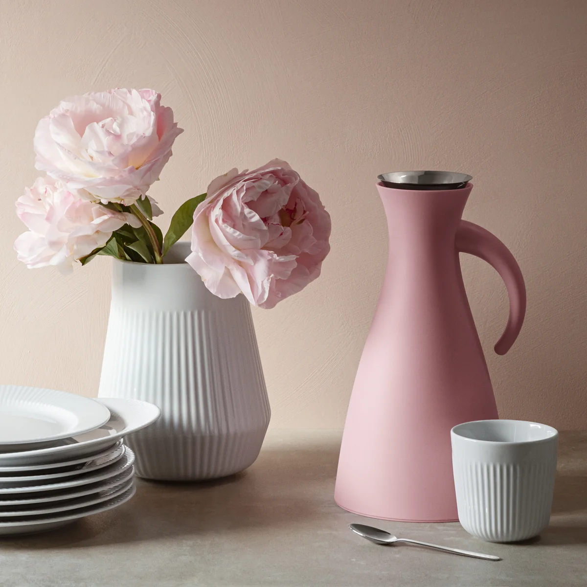 Die preisgekrönte Isolierkannenserie von Eva Solo besteht außen aus Kunststoff und ist innen mit einem austauschbaren Glaskolben ausgestattet. Sowohl die hohen als auch die niedrigen Varianten haben ein Fassungsvermögen von 1,0 l und sind in verschiedenen Farben erhältlich.