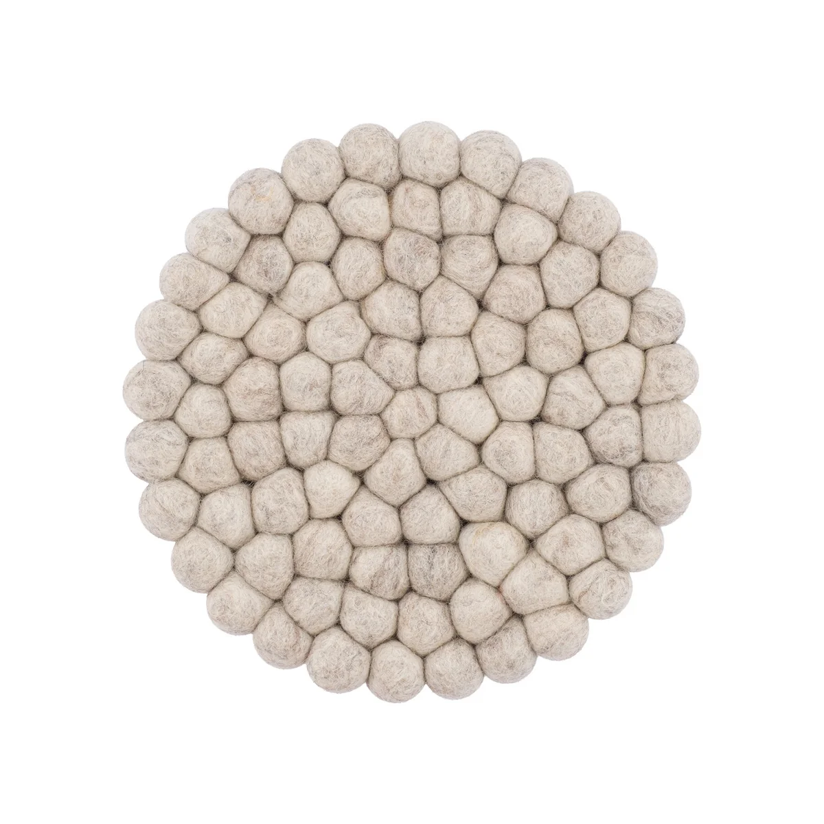 Die Topfuntersetzer, wie auch die Teppiche von myfelt, bestehen zu 100% aus neuseeländischer Schurwolle, die zu der hochwertigsten der Welt gehört. In der Teppichmanufaktur in Nepal wird die unbehandelte Wolle gekämmt und mehrmals gewaschen. Das anschließende Filzen ist der aufwendigste Arbeitsschritt. In Handarbeit wird jede einzelne Kugel durch mehrere Arbeitsschritte in ihre endgültige Form gebracht. Danach werden die fertigen Kugeln mit einem speziell von myfelt entwickelten Knüpfverfahren zum endgültigen Produkt vernäht.