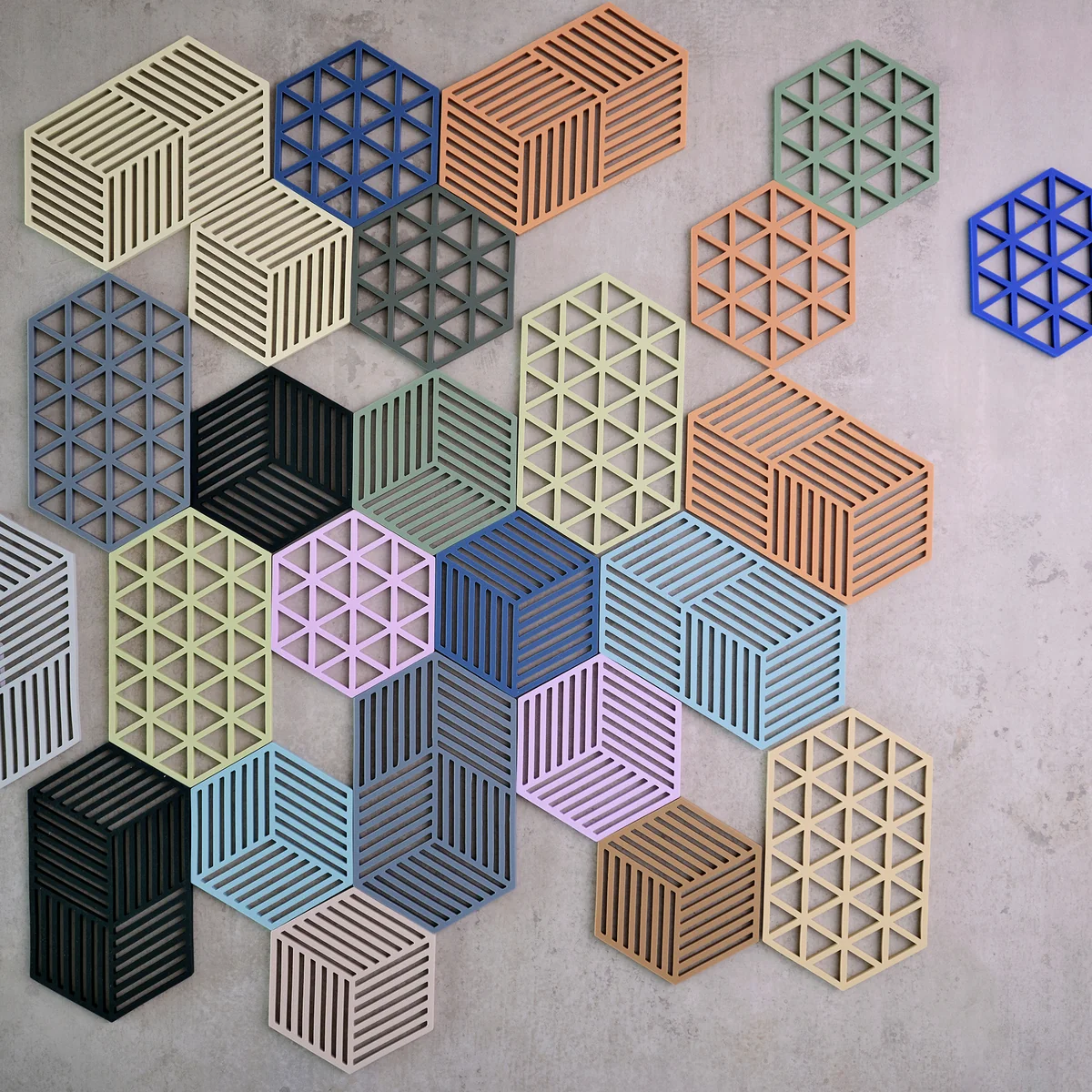 Nicht nur durch seine praktischen Eigenschaften überzeugt der Untersetzer, auch optisch macht er etwas her und setzt aufgrund seines geometrischen Musters moderne und stilvolle Akzente auf dem Tisch. Zu mehreren in verschiedenen Farben und Varianten aneinandergelegt, bietet der Untersetzer Platz für größere Töpfe und sorgt nebenbei für einen tollen Hingucker auf dem Esstisch. Erhältlich ist der Untersetzer zudem in der Triangle Variante, die sich jedoch hervorragend mit dem Hexagon Modell kombinieren lässt.