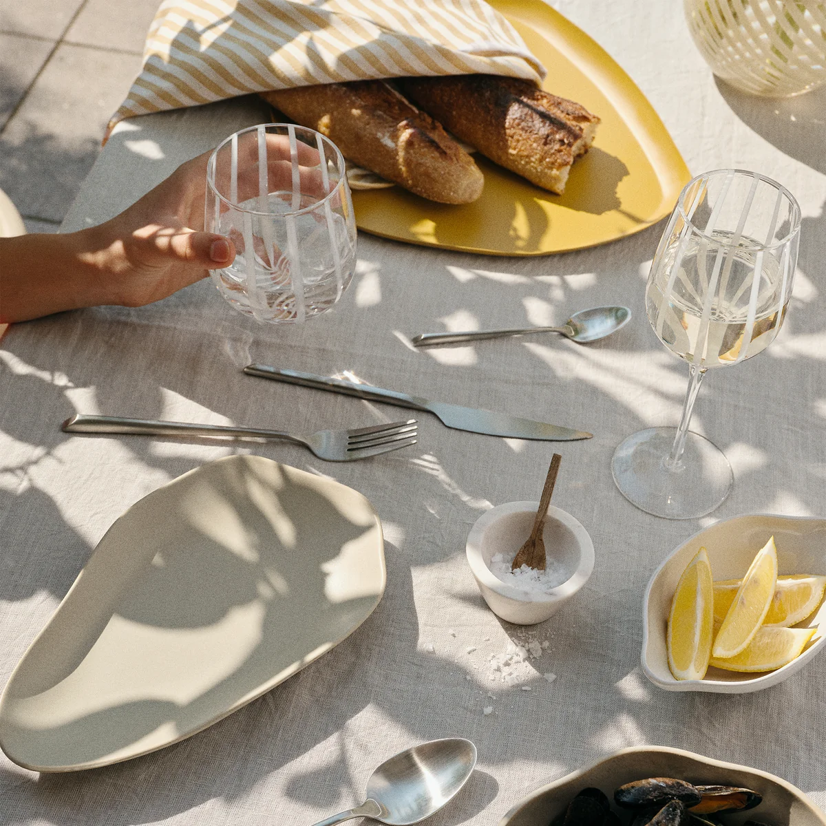 Das Stripe Geschirr von Broste Copenhagen macht sich auf jedem Tisch erkenntlich. An warmen Sommertagen schaffen die minimalistischen Streifen, auf dem dünnen und eleganten Glas, ein ästhetisches und charmantes Schattenspiel auf dem Tisch. Auf diese Weise ziert das italienische Design jeden gedeckten Tisch und bringt eine stilvolle Dynamik in die Ambiente, die keinen Schatten auf die restlichen Stücke wirft. In unterschiedlichen Ausführungen erhältlich, können die Produkte der Stripe-Reihe einzeln oder kombiniert, in individuellen Sets, verwendet werden.