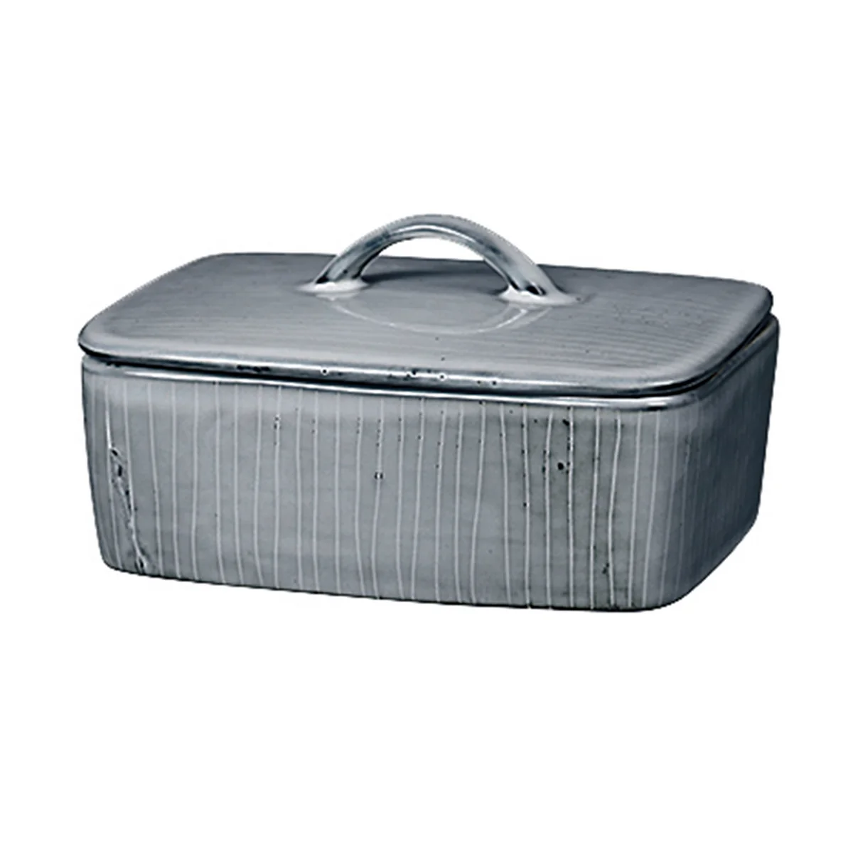 Die Butterdose ist Teil der Nordic Geschirr Serie, dem Herzstück des Labels Broste Copenhagen. Seit der Einführung 2009 findet man das Geschirr in vielen Restaurants und Küchen auf der ganzen Welt. Der sanfte Farbverlauf wird durch ein spezielles Brennverfahren erzeugt und steht für die ursprüngliche Kraft des Ozeans. Jedes Stück ist ein Unikat, da die Glasur dynamisch im Brennofen reagiert und so zu unterschiedlichen Texturen und Farben führen kann.