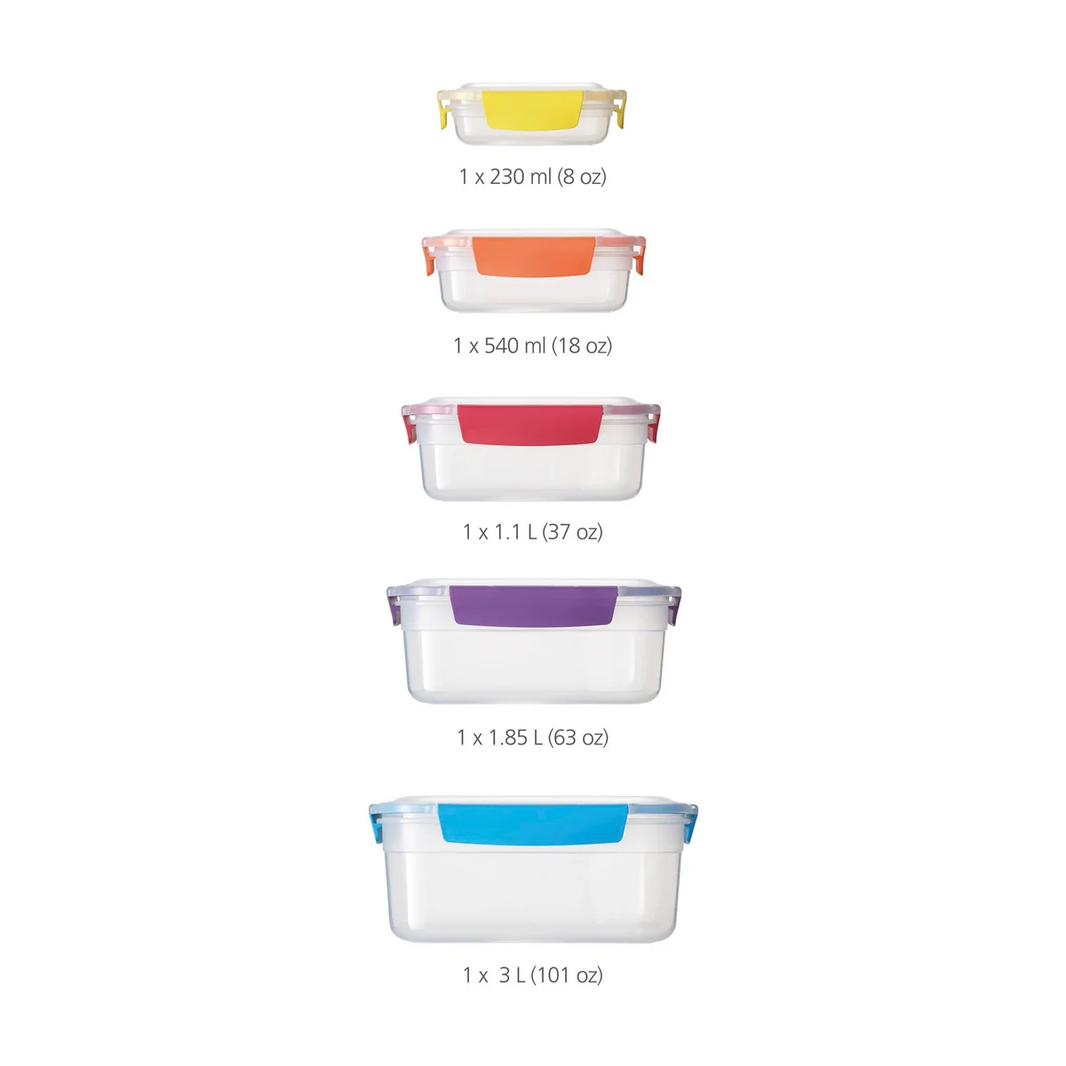 | Details | Im Set enthalten: 1x 230 ml, 1x 540 ml, 1x 1,1 l, 1x 1,85 l, 1x 3 l. |