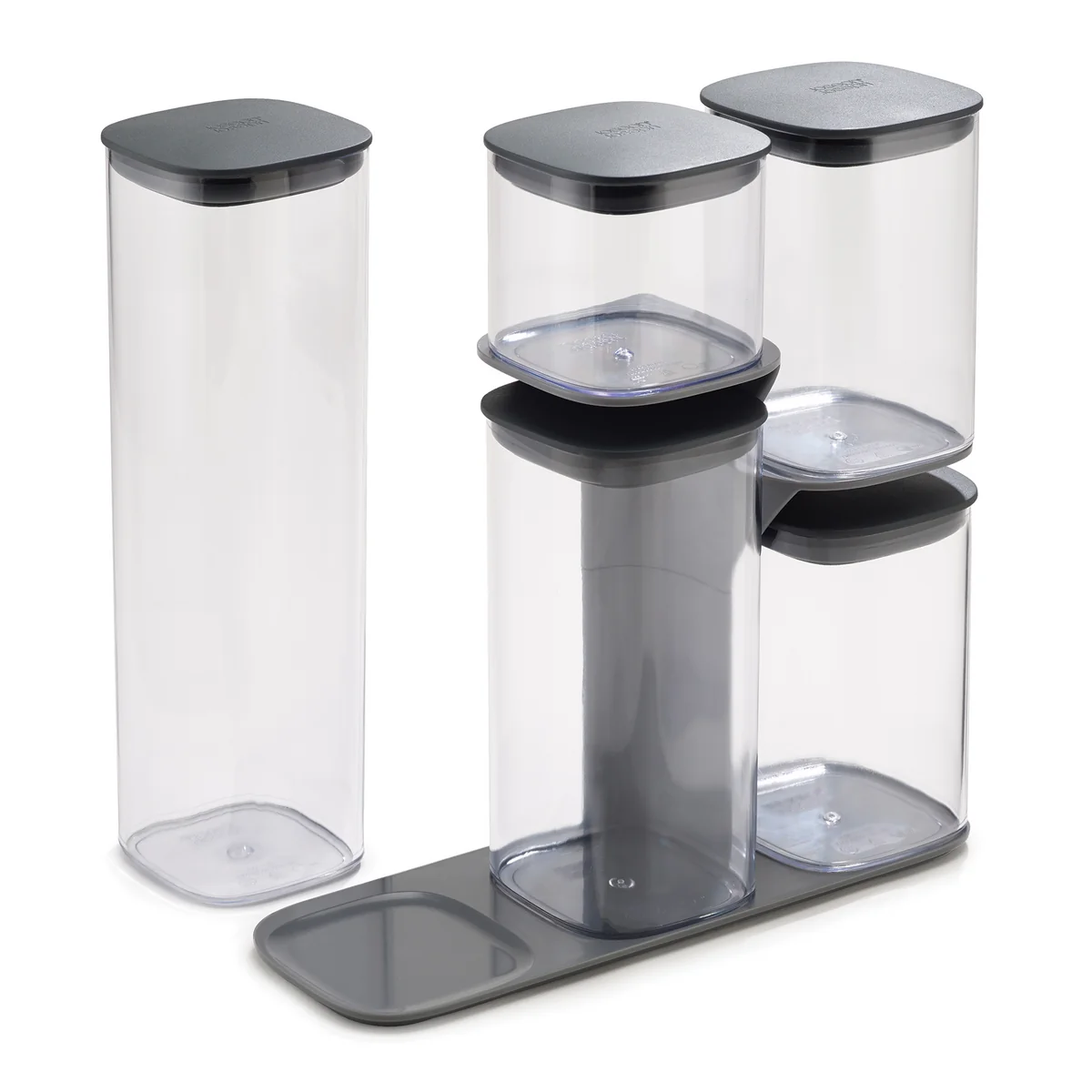 Das Podium Aufbewahrungsbehälter-Set mit Ständer von Tim Rundle für Joseph Joseph bietet einfachen Zugriff auf gestapelte Aufbewahrungsbehälter, unabhängig von der jeweiligen Position. Mit Podium ist auch das unterste Glas einfach zu entnehmen, ohne dass dabei die gesamte Konstruktion in sich zusammenbricht. Eine clevere Basis sorgt dafür, dass Behältnisse verschiedener Größen übereinander gestapelt werden können und dabei besonders in kleineren Küchen Platz sparen.