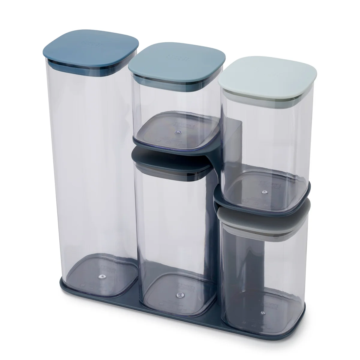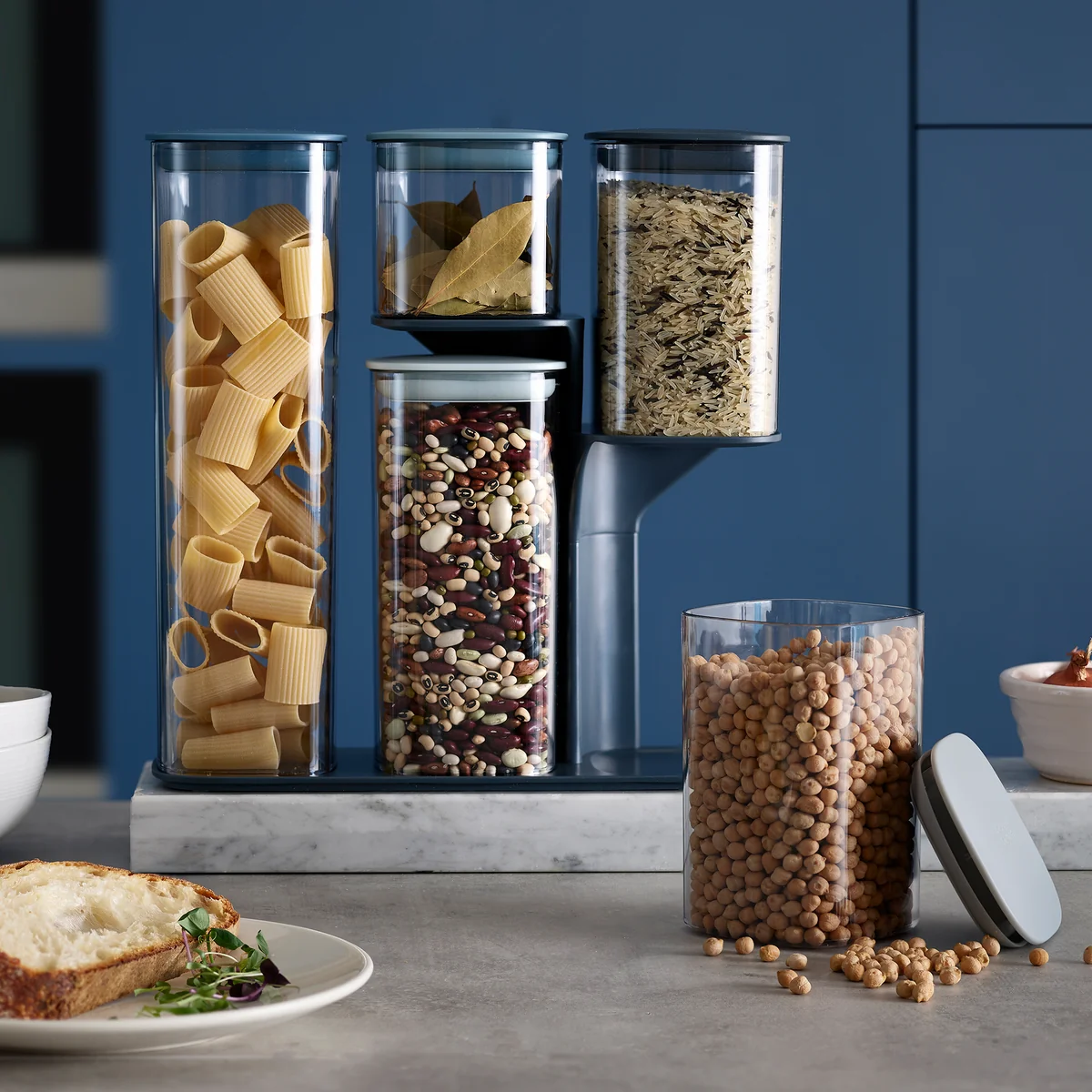 Podium besteht aus einer rutschfesten Basis und jeweils drei oder fünf Aufbewahrungsbehältern in verschiedenen Größen, die sicher von der Basis gehalten werden. In ihnen können Spaghetti, Reis, Bohnen, Müsli und vieles mehr aufbewahrt werden. Luftdichte Deckel halten dabei die Lebensmittel frisch und die abgerundeten Ecken sorgen für ein einfaches Ausschütten. Behälter und Deckel sind nur von Hand zu reinigen und die Basis kann mit einem feuchten Tuch abgewischt werden.
