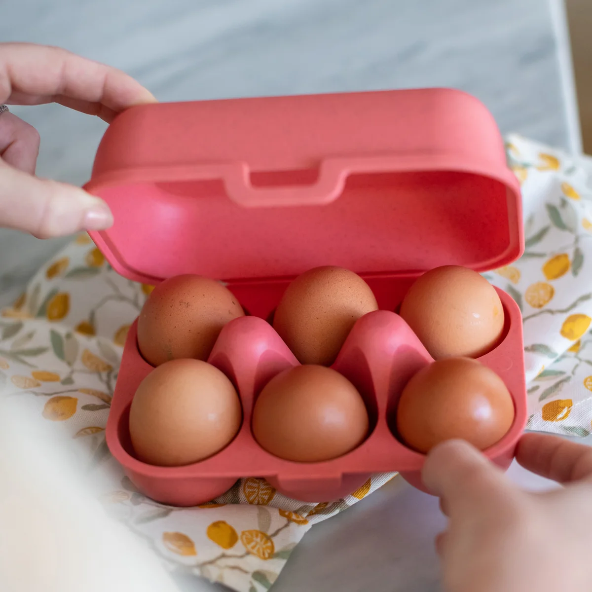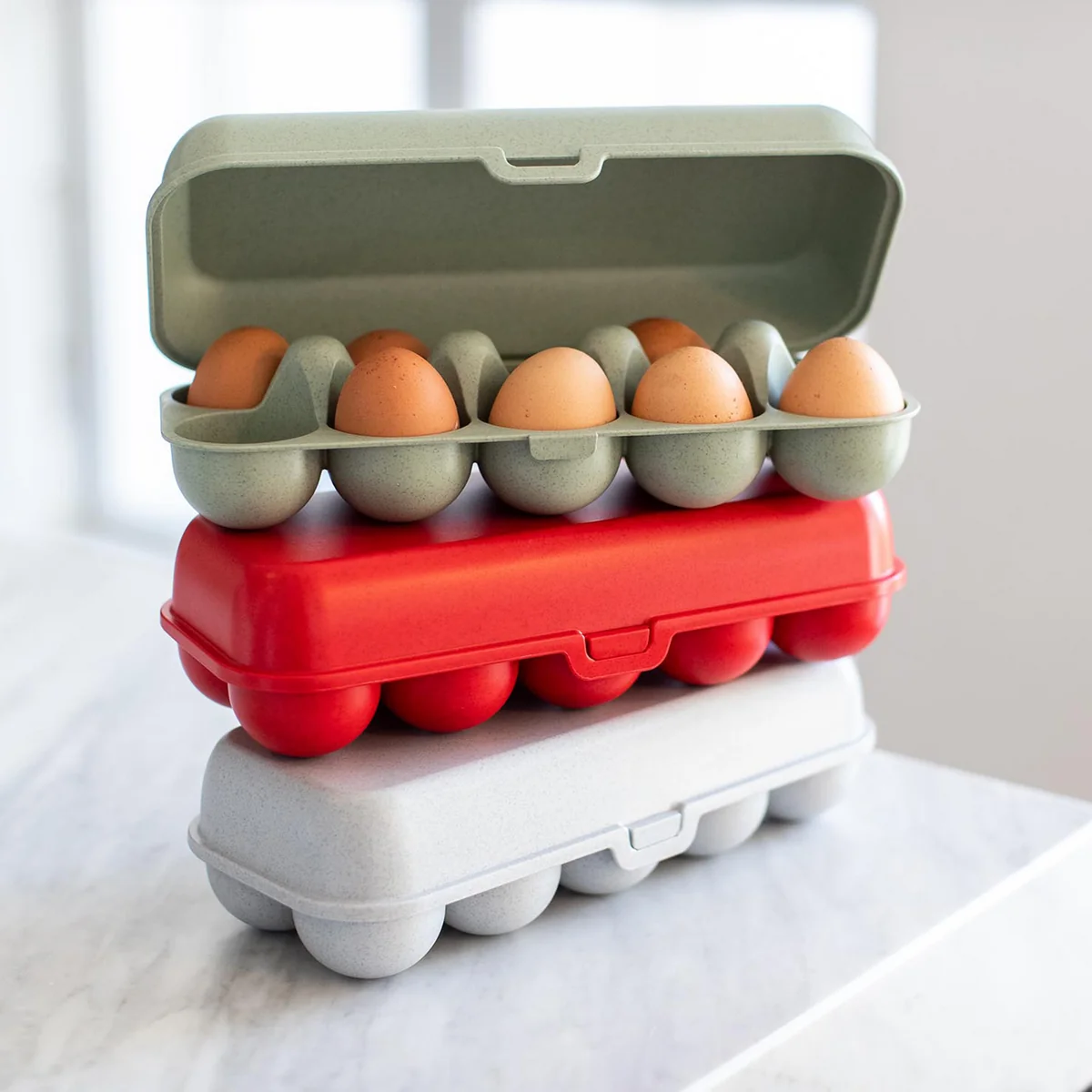 Koziol fertigt die Produkte aus der Organic Kollektion aus thermoplastischem Kunststoff mit natürlicher Zellulose. Alle Produkte sind garantiert lebensmittelecht, frei von Melaminformaldehydharzen, Weichmachern oder BPA und werden umweltfreundlich hergestellt. Das verwendete Material ist zu 100 % recycelbar und besonders hygienisch im Gebrauch. Es ist zudem sehr robust und verhindert das Zerdrücken der Eier im Eggs to go Mehrwegbehälter. Im Kühlschrank können die Boxen problemlos gestapelt werden. Außerdem sind die Organic Eierbehälter spülmaschinenfest bei bis zu 100°C.