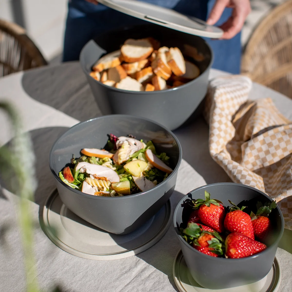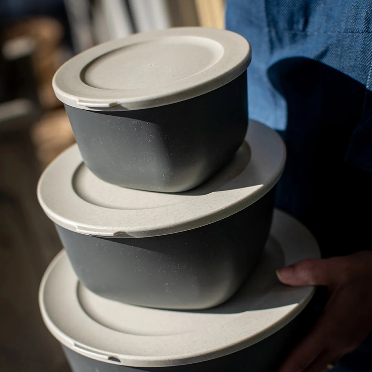 Koziol fertigt die Connect Vorratsdose aus thermoplastischem Kunststoff mit Zellulose. Damit ist die Aufbewahrungsdose umweltfreundlich, nachhaltig, wiederverwendbar, lebensmittelecht, recycelbar und garantiert ohne Formaldehyd oder BPA. Alle Schüsseln sind ineinander stapelbar und nehmen so im Schrank ein Minimum an Platz ein.