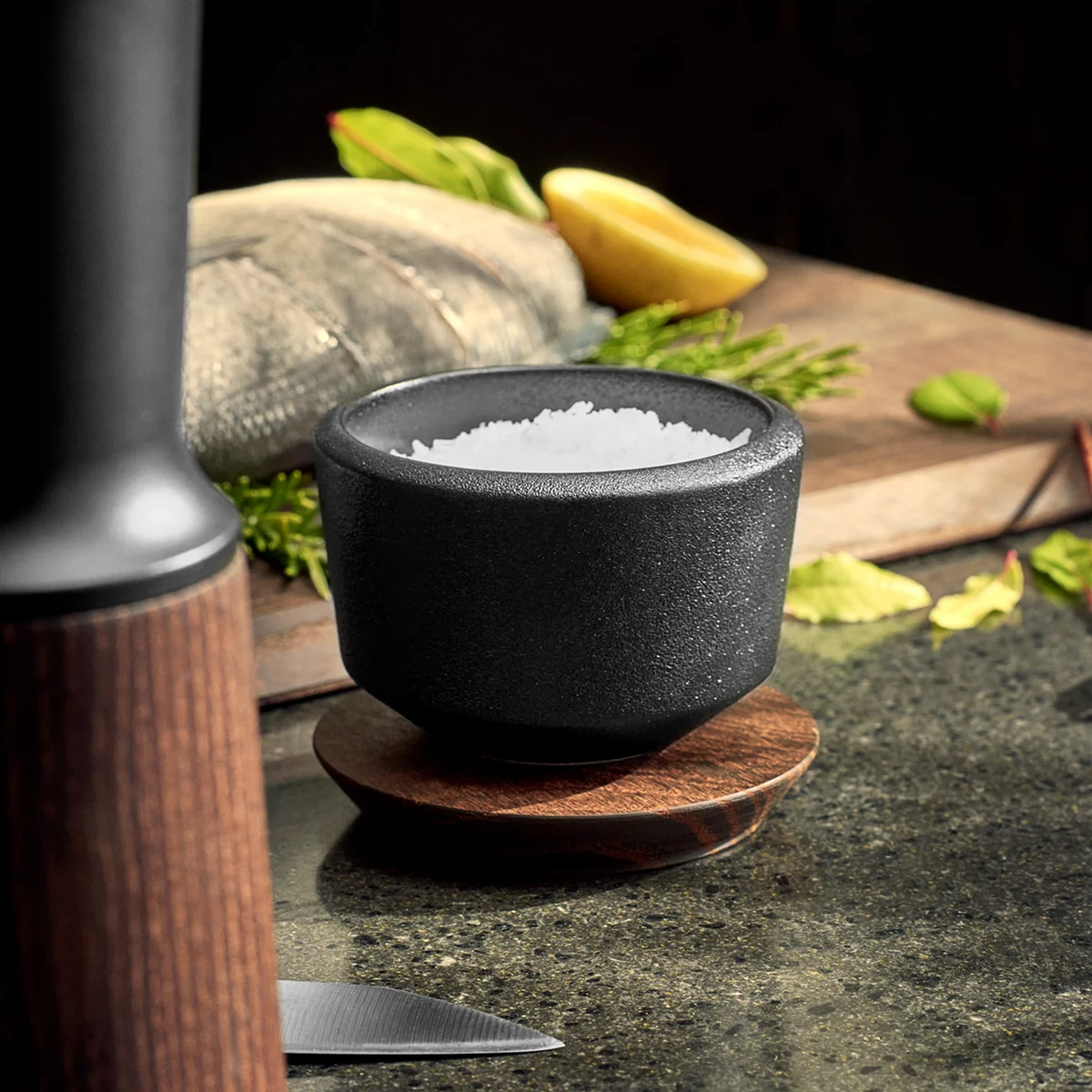 Entworfen von Jesper Vollmer wird das Salz in dieser Schale vor Schmutz geschützt und nicht so schnell fade. Der Deckel kann auch als Mini-Tablett für die Schale dienen.