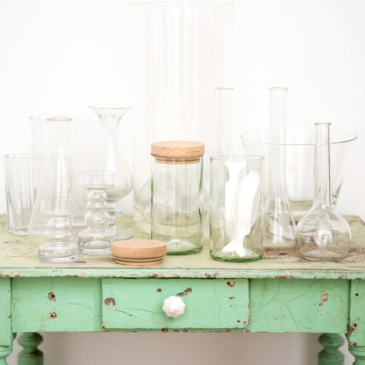 Das von Jette Scheib entworfene Vorratsglas ist in klarem und grün gefärbtem Glas erhältlich. Es wurde in der Caritas Wendelstein Werkstatt Raubling hergestellt.