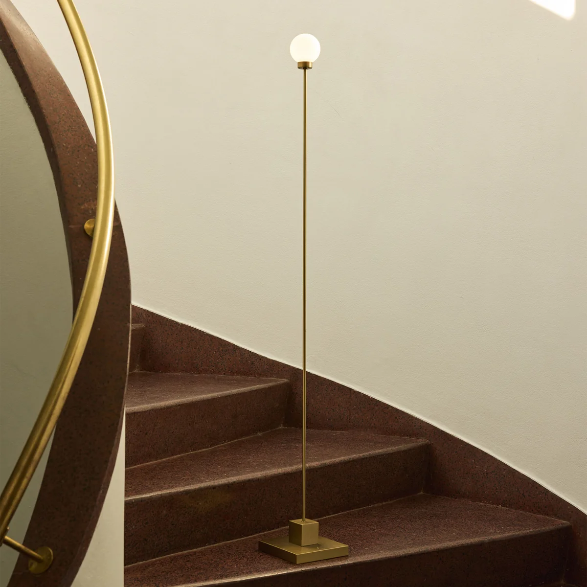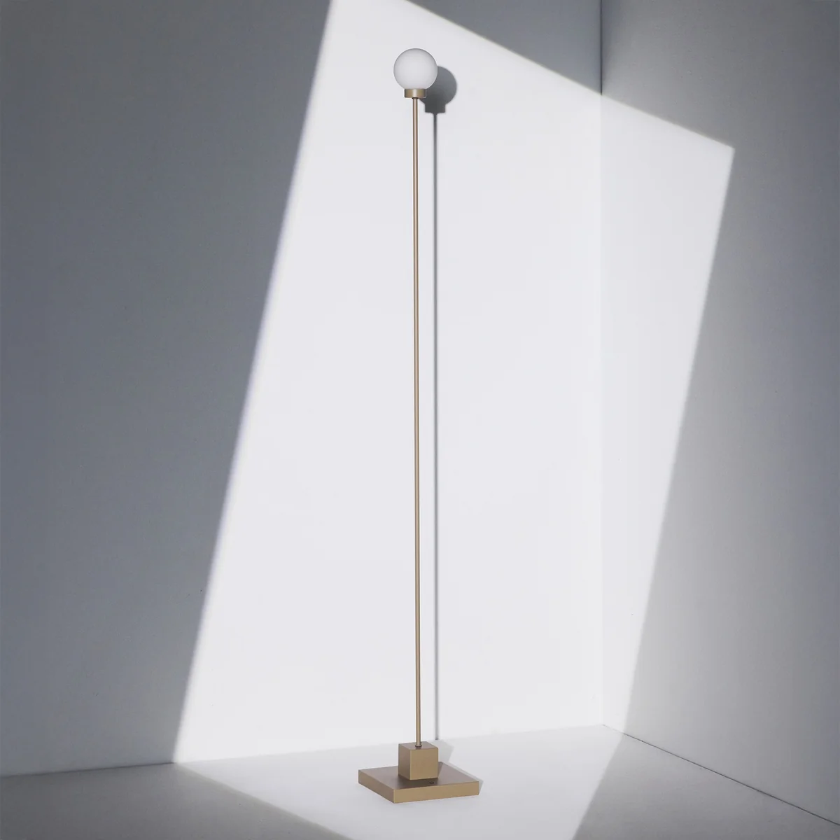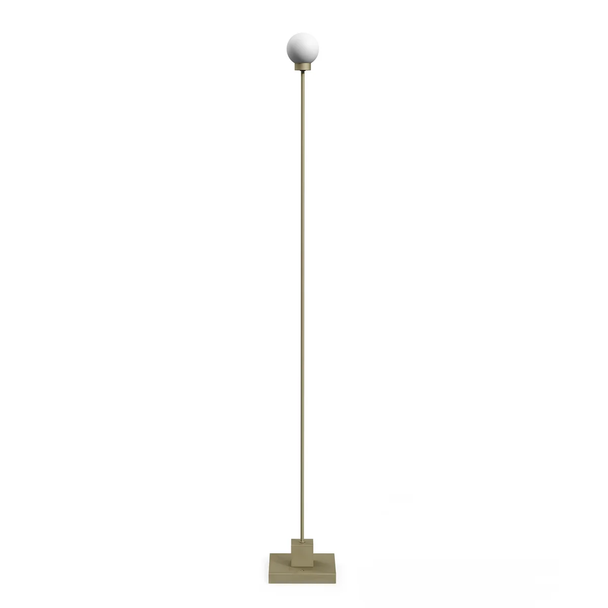 Der schlanke Metallfuß ruht auf einem rechteckigen Sockel und trägt einen kugelförmigen Schirm aus satiniertem Glas, der sanftes, diffuses Licht spendet. Der runde Schirm bildet einen harmonischen Kontrast zur strengen, linearen Basis.