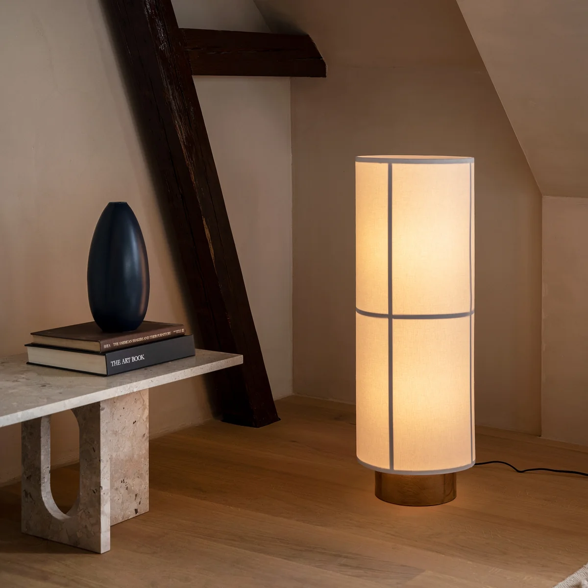 Die Hashira Bodenleuchte von Norm Architects für Audo ist von den traditionellen, japanischen Reispapierlaternen inspiriert und präsentiert sich in modernem Gewand. Gefertigt aus semi-transparentem Leinengewebe, lässt das Material das Licht sanft hindurch scheinen, sodass eine angenehme Atmosphäre im Raum entsteht. Dabei wird auch das innere Gitter als Schatten sichtbar und verleiht dem Gesamtbild eine gewisse Struktur. Der Name geht auf die zylindrische Form zurück, denn Hashira bedeutet auf japanisch so viel wie Säule.