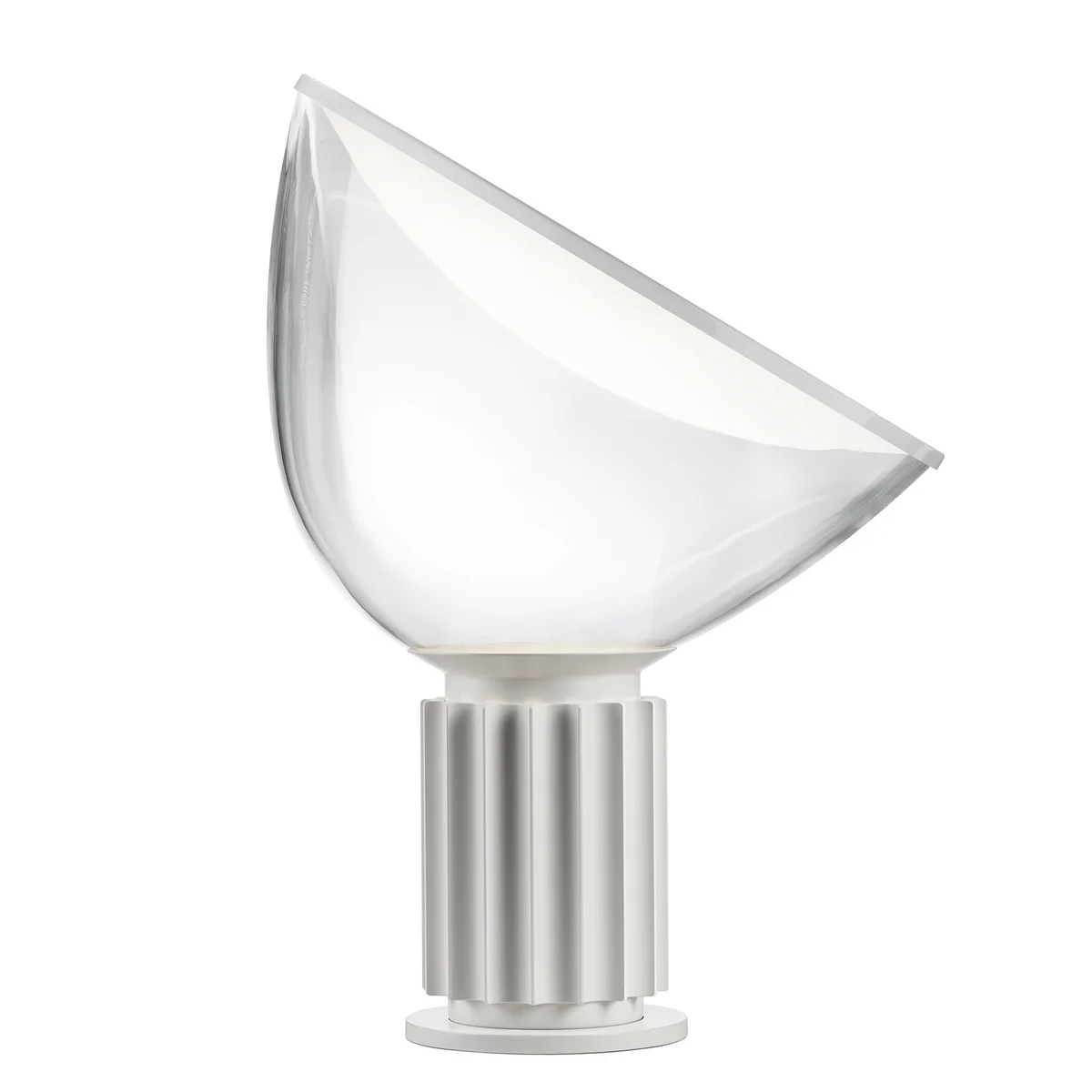 Der Reflektor der Taccia Tisch- und Bodenleuchte verfügt über eine glänzend weiß lackierte Innenfläche und eine weiß pulverbeschichtete Außenfläche. Der verstellbare Diffusor besteht aus mundgeblasenem, transparentem Glas, der Leuchtenkörper aus schwarzem oder silbern eloxiertem Aluminiumstrangguss. Der Sockel besteht aus poliertem, vernickeltem und zaponlackiertem Stahl. Das Ein- und Ausschalten erfolgt über einen Schalter am Elektrokabel.