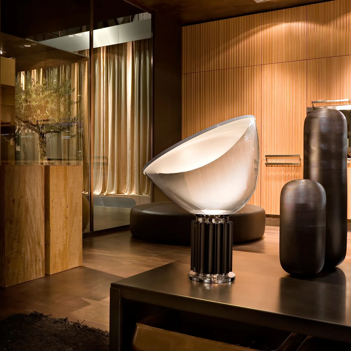 In einem Interview von 1970 sagte Altmeister Achille Castiglioni über die Taccia: "Für uns ist sie der Mercedes-Benz unter den Leuchten; ein Symbol des Erfolges, möglicherweise weil der Sockel einer altertümlichen Säule ähnelt. Als wir die Taccia-Leuchte entwarfen, stand allerdings nicht das Prestige im Vordergrund. Uns ging es im Wesentlichen um eine Oberfläche, die kühl bleibt".