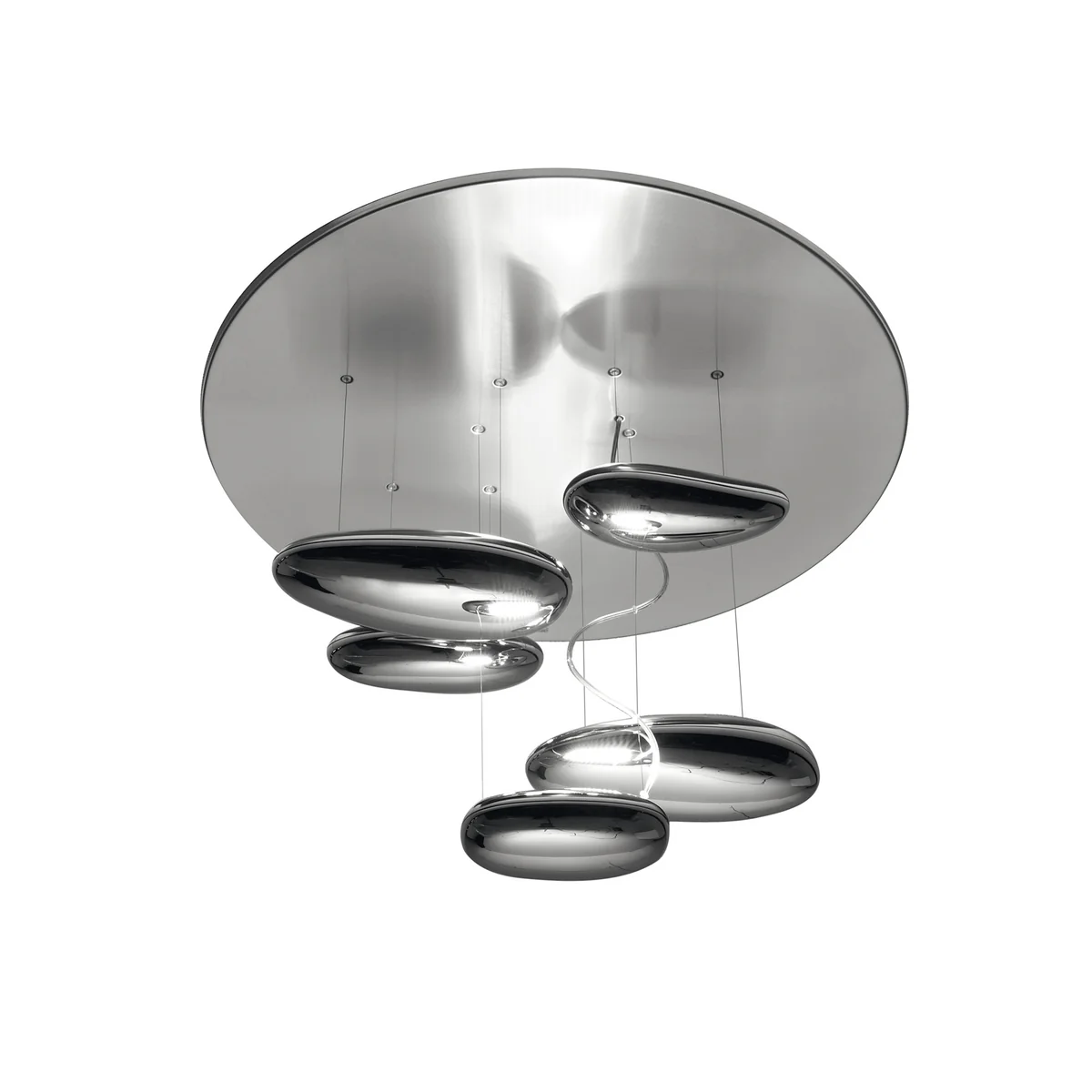 Der Decken-Reflektor besteht aus Edelstahl, während die Lichtsteine aus Spritzguss-Thermoplast gefertigt und mit einer Metallic-Oberfläche versehen wurden. Die Mercury Deckenleuchte ist außerdem über eine Push-Funktion dimmbar.