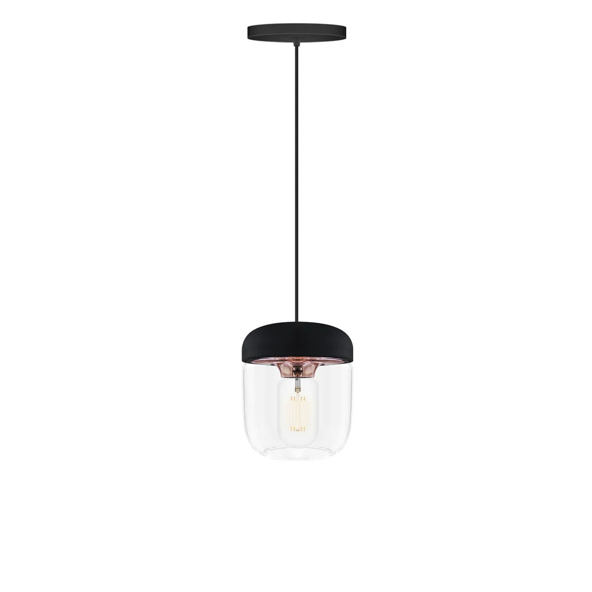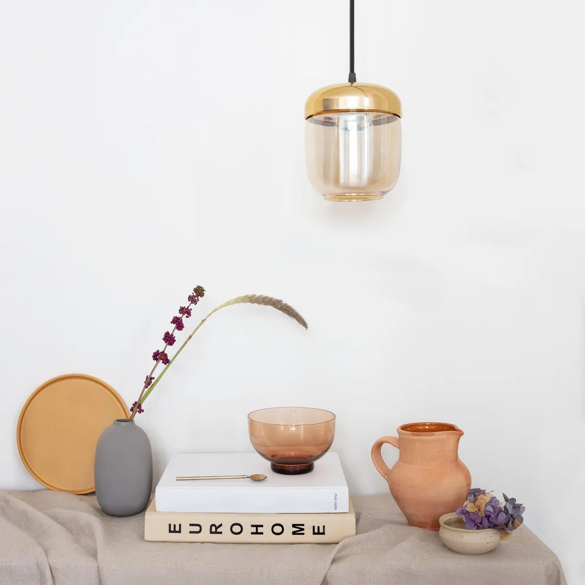 Eine Eichel besteht aus drei Teilen: einer weichen Schale, einer Kappe und einer Nussfrucht im Innern. Ähnlich dazu ist auch die Pendelleuchte von Umage aufgebaut: Eine glatte, äußere Schale aus Glas wird an einer Seite von einer Schale umschlossen. Im Inneren begeistert die Acorn Leuchte mit einem metallischen Finish in Kupfer, Stahl oder Messing.