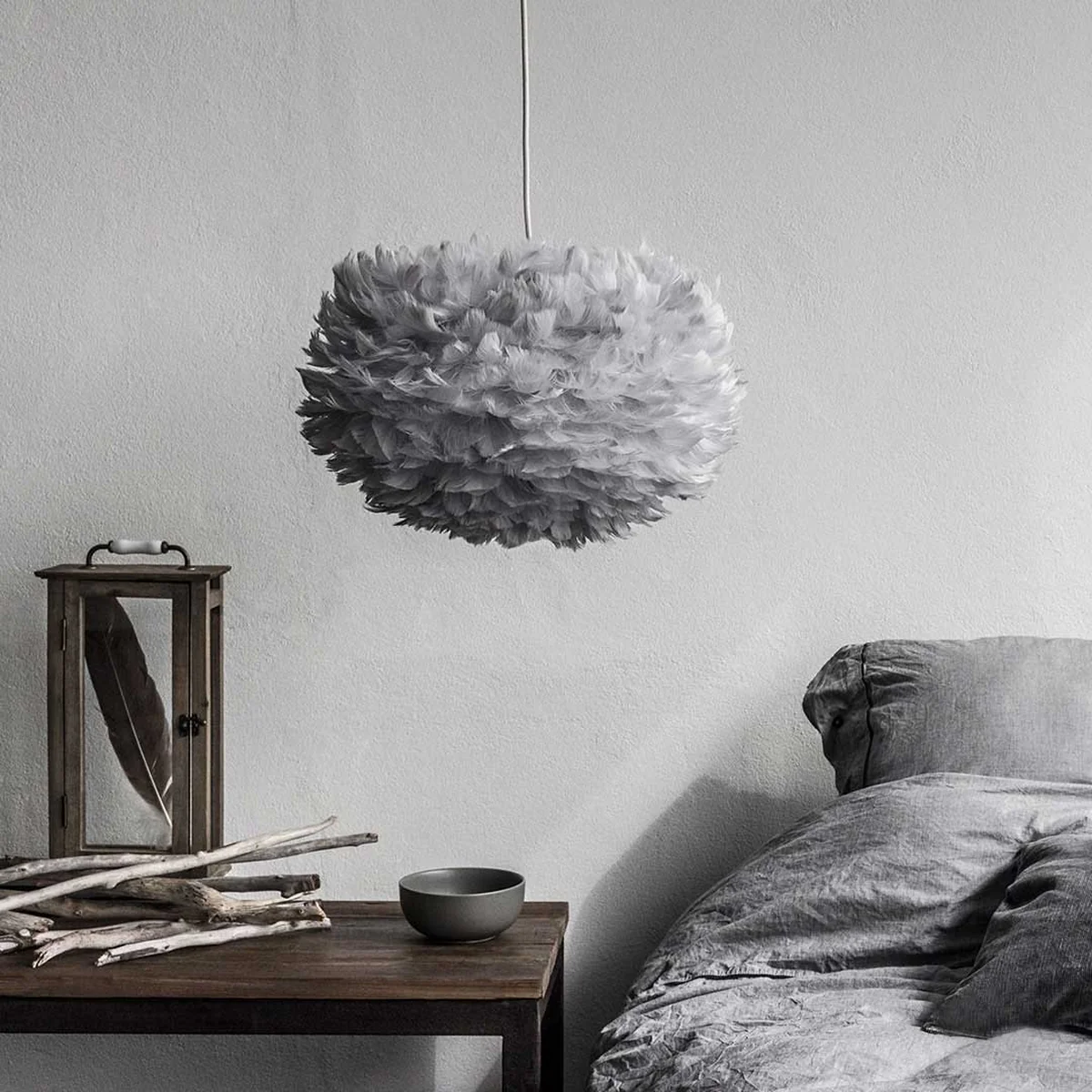 Jede einzelne Feder wird bei der Umage Eos Pendelleuchte in Hellgrau sorgfältig mit der Hand aufgebracht. Durch die Federn gedämpft, erstrahlt die Eos Leuchte in einem warmen, indirekten Licht. Damit lässt sich die Federnleuchte besonders im Wohn- und Schlafbereich einsetzen - dort schafft die Umage Leuchte eine gemütliche und atmosphärische Stimmung.