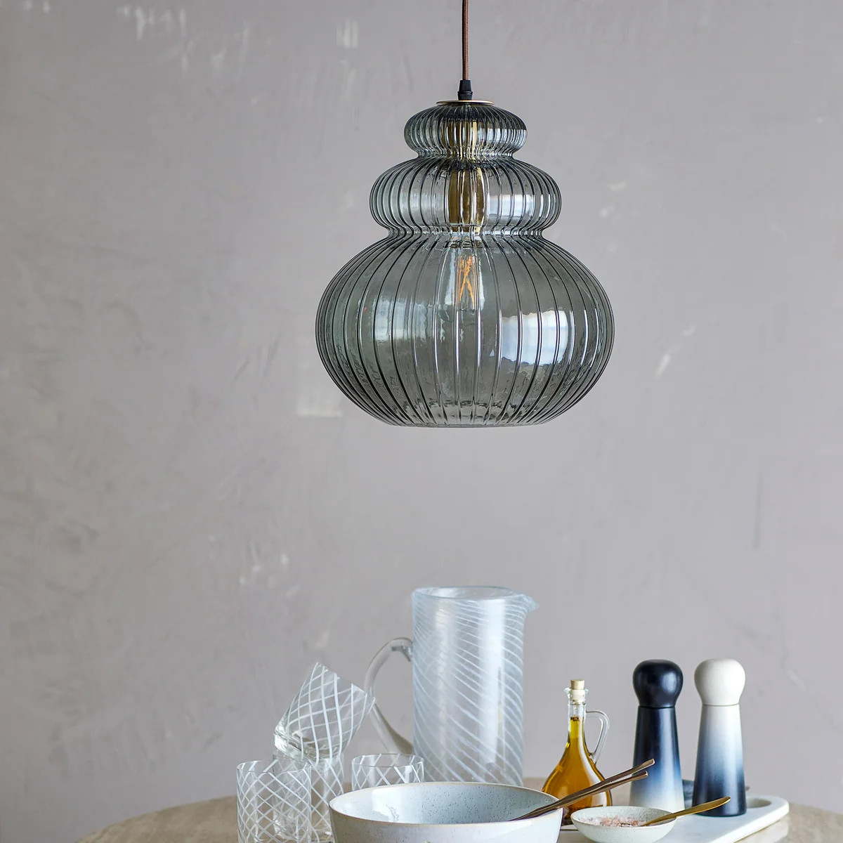 Die Sybia Pendelleuchte von Bloomingville besticht durch ihre klare Formensprache und einen sanft getönten Glasschirm. Das dezente Design wird durch textile Details und metallische Akzente abgerundet – ideal über Esstisch, Kücheninsel oder im Flur.
