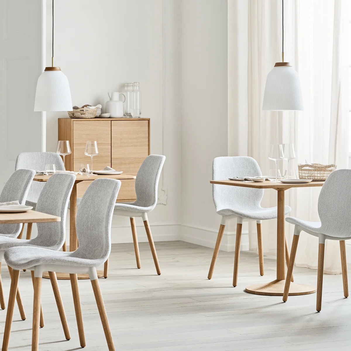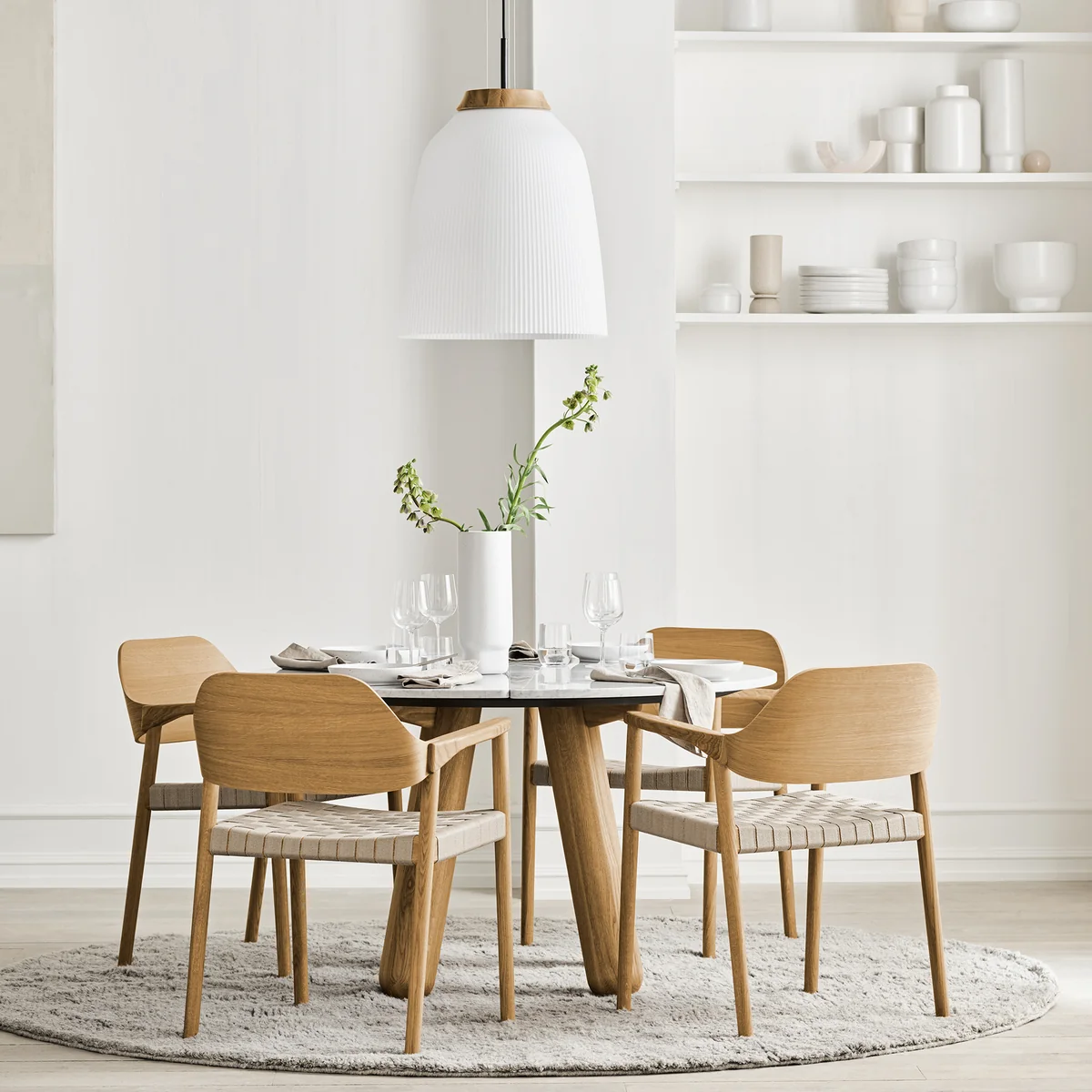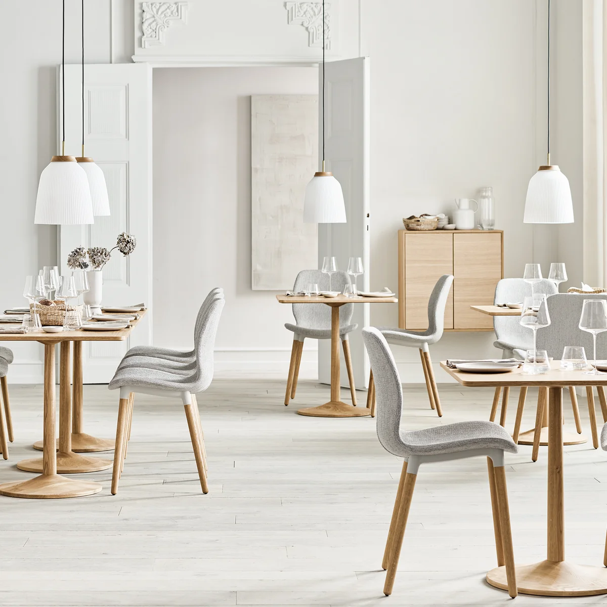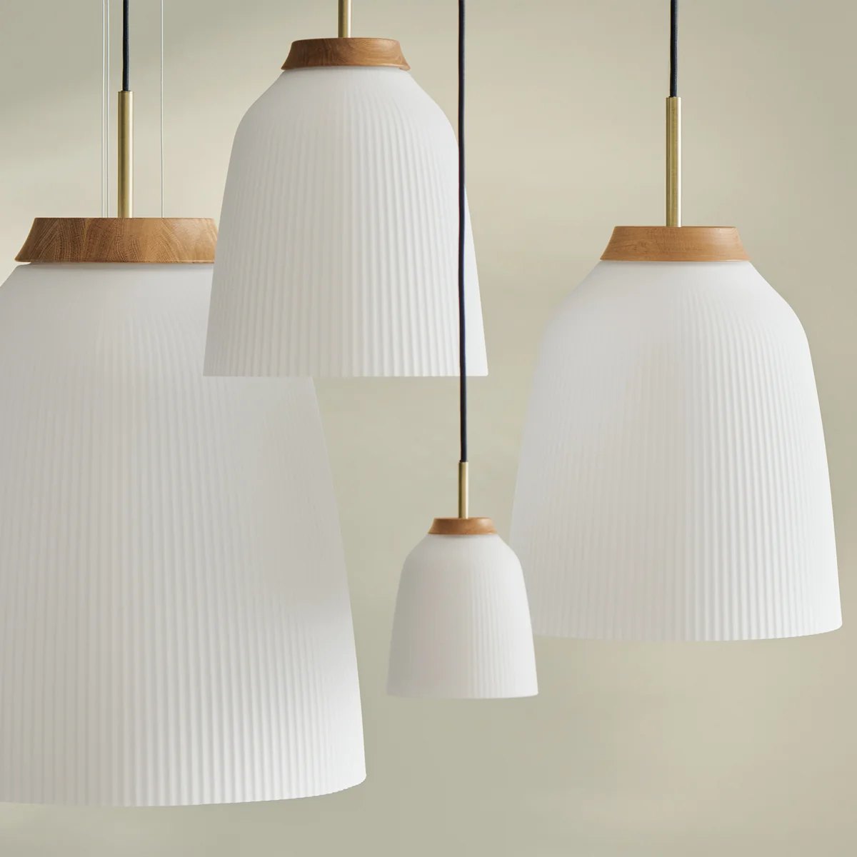 Die Campa Pendelleuchte aus dem Hause Bolia ist ein Entwurf des dänischen Architekturbüros Spant, der eine Serie von Leuchten mit einem auffällig elegant geformten Schirm aus geriffeltem Opalglas und raffinierten Holzdetails umfasst.