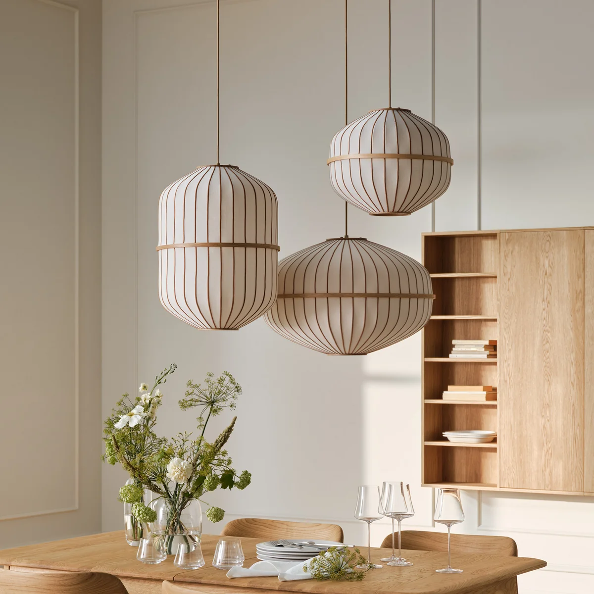Die Lucén Pendelleuchte von Bolia verbindet skandinavische Klarheit mit japanischer Zurückhaltung – eine stilvolle Hommage an das Japandi-Design. Der leichte Metallrahmen wird von feinen Eichenholzringen und sanft drapiertem Stoff umhüllt, was der Leuchte eine weiche, atmosphärische Ausstrahlung verleiht. Die FSC™-zertifizierte Eichenfurnier-Bespannung unterstreicht den nachhaltigen Anspruch und macht Lucén zu einer ebenso umweltbewussten wie ästhetischen Lichtquelle. In verschiedenen Formen und Größen erhältlich, fügt sie sich harmonisch in Wohn- und Objektbereiche ein.