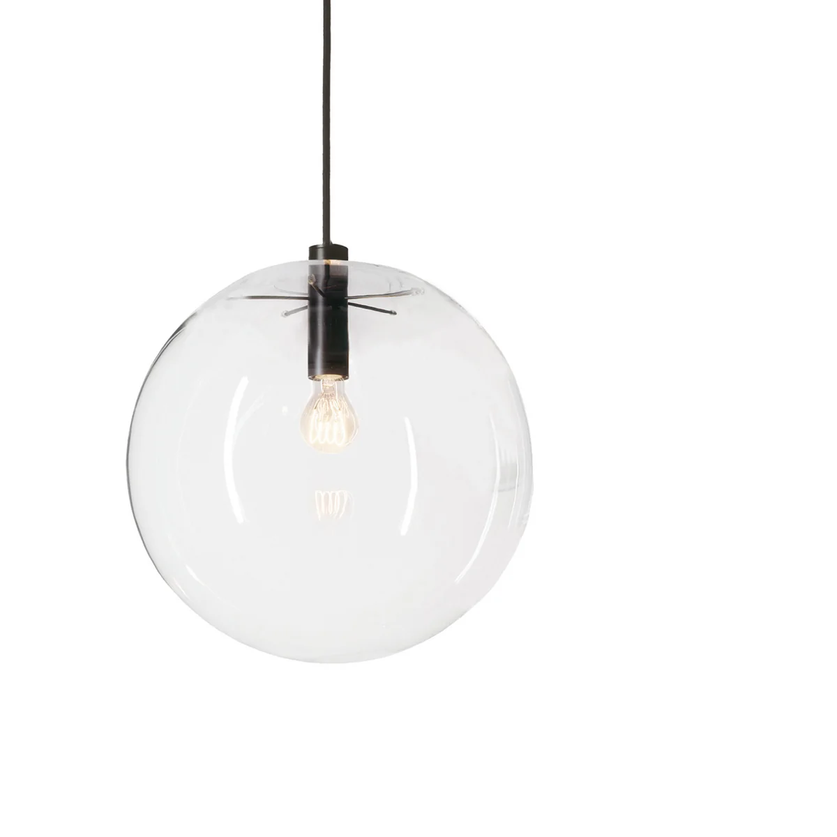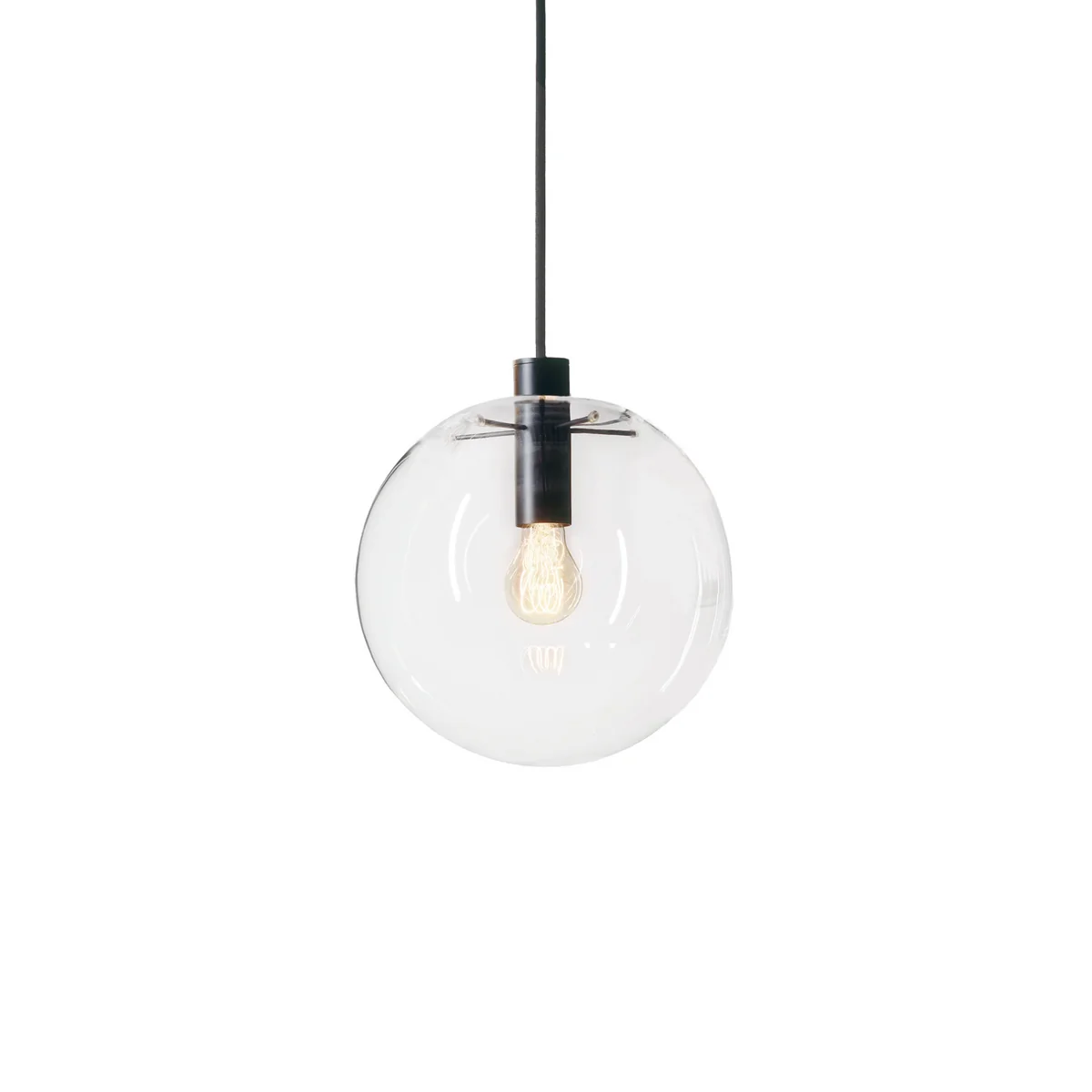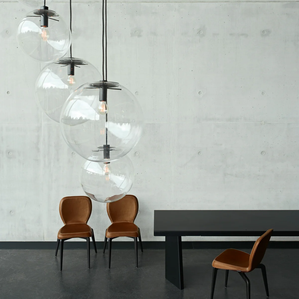 Optische Offenheit ist das Grundprinzip der ClassiCon Selene Pendelleuchte: Durch die mundgeblasene Klarglaskugel der Selene ist der Diffusor sichtbar, der genau wie die Glaskugel über eine klare, geometrische Formensprache verfügt und über einen fünfarmigen Leuchtenkopf aufgehängt ist. Das schwarze, stoffummantelte Kabel macht den hochwertigen Eindruck komplett.