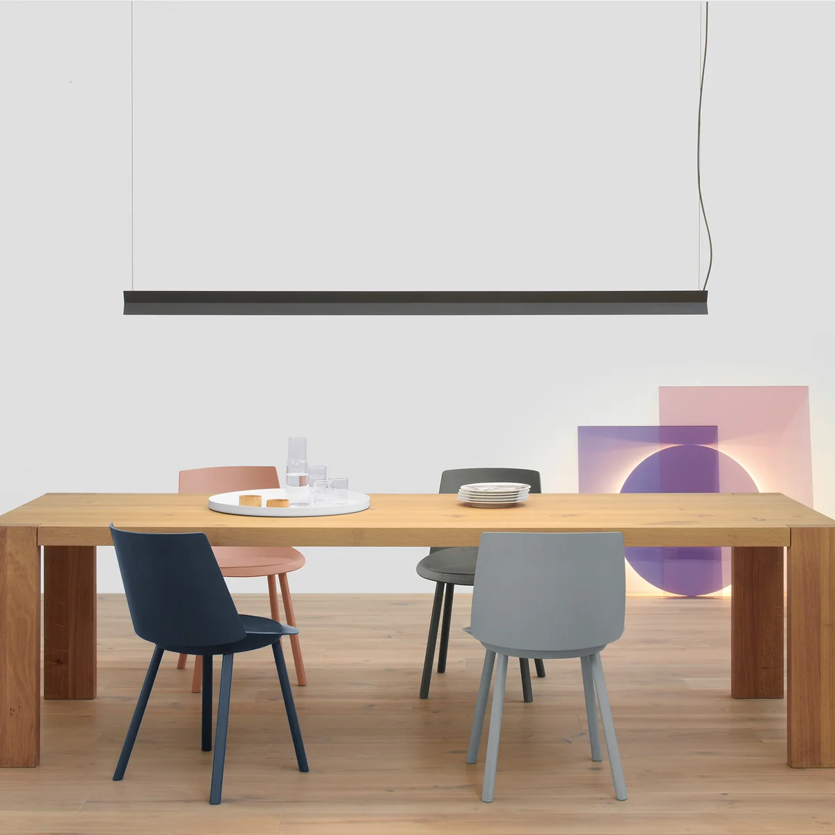 Die Span Pendelleuchte, entworfen von Michael Raasch im Jahr 2014, besticht durch ihre schlichte Eleganz und ihre hohe Funktionalität. Die x-förmige Leuchte ist an zwei Befestigungspunkten ausbalanciert und leitet das Licht effizient auf die darunter liegende Tischfläche, während sie gleichzeitig ein angenehmes Lichtambiente für die Decke erzeugt, ohne zu blenden. Diese Eigenschaften machen sie ideal für den Einsatz über Ess- und Arbeitstischen. Mit zwei integrierten Diffusoren sorgt die Span Pendelleuchte für blendfreies Licht, besonders bei einer empfohlenen Höhe von 650 mm über der Tischfläche. Die Leuchte kann durch externe Zusatzgeräte wie einen DALI-Konverter in Smart-Home-Systeme integriert werden, um eine intelligente Lichtsteuerung zu ermöglichen.