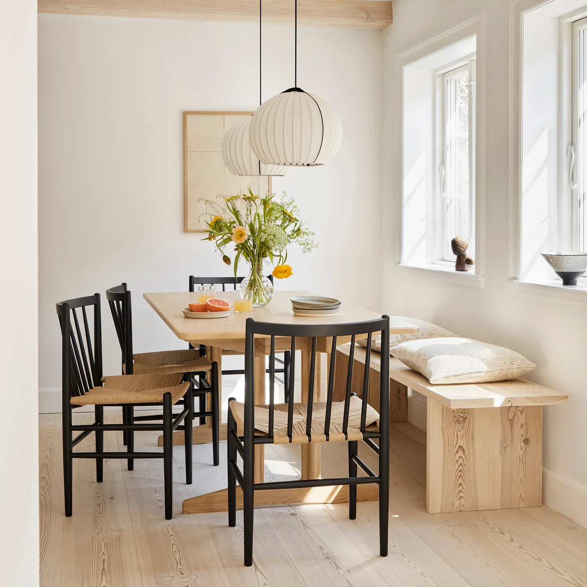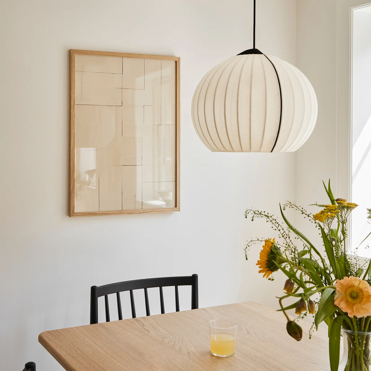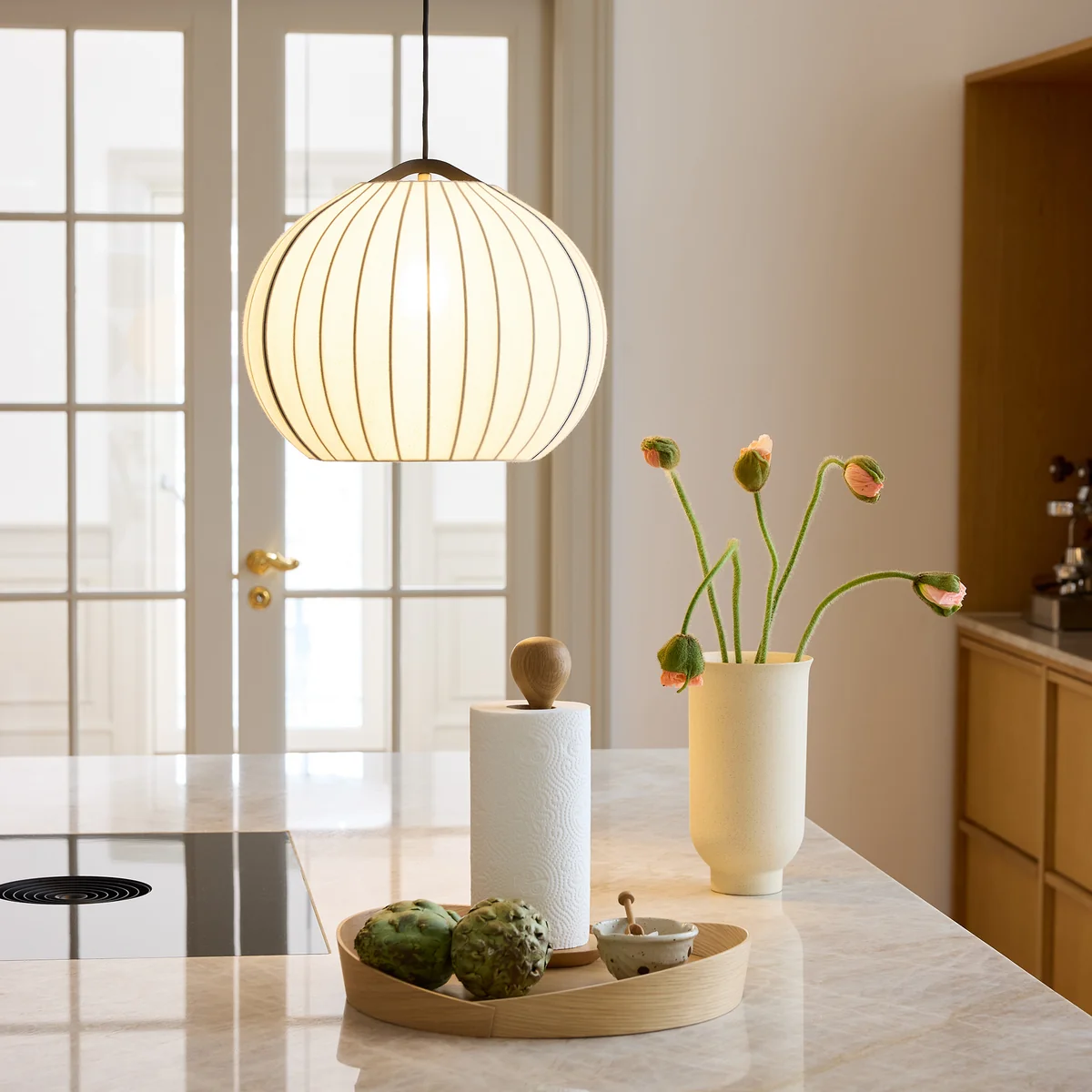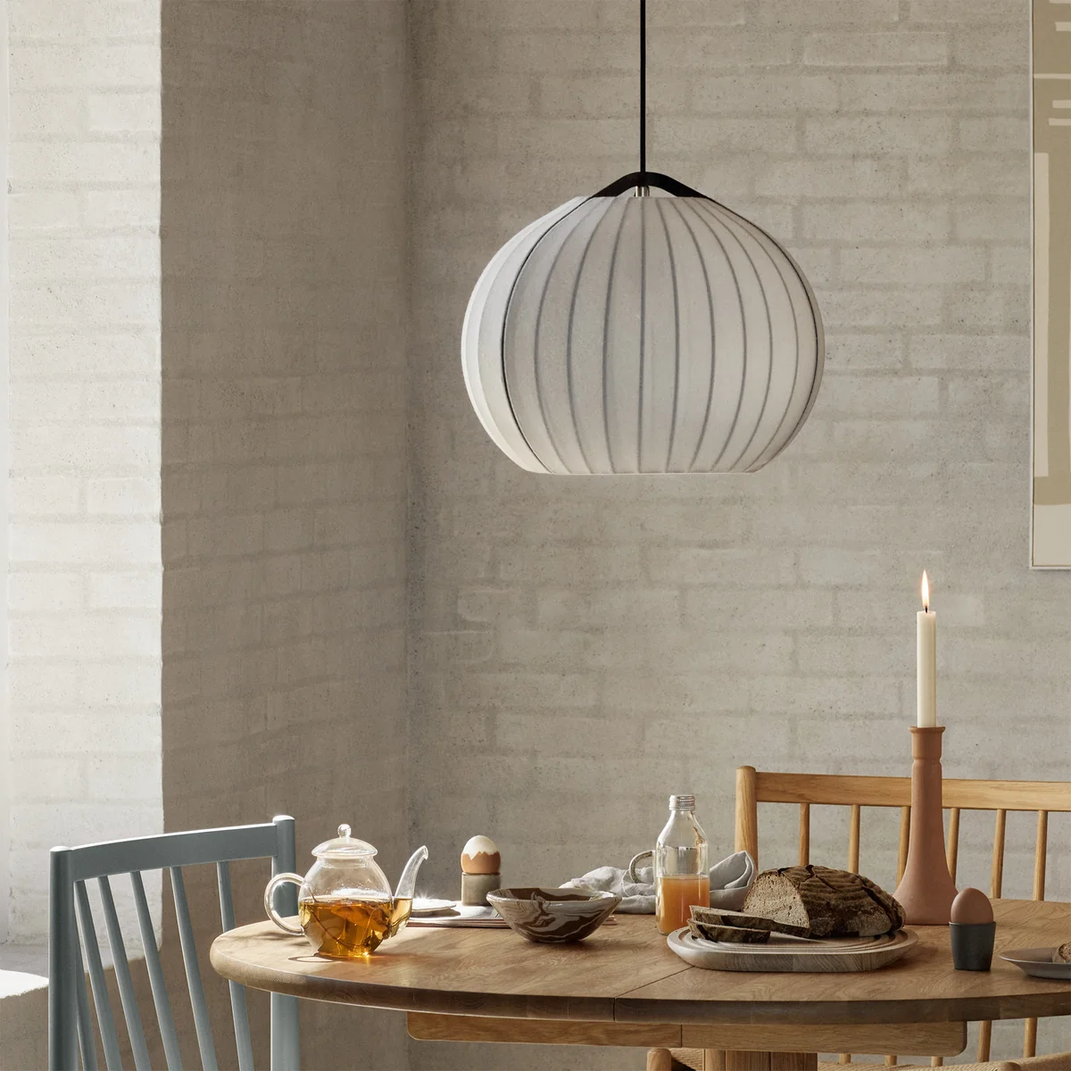 Der schwarze Metallrahmen setzt einen klaren, grafischen Kontrast zu den zarten Stoffen und verleiht der Leuchte Stabilität und visuelle Tiefe. Im eingeschalteten Zustand entsteht ein detailliertes Lichtspiel, das die Struktur der Leuchte betont und dem Raum eine ruhige, elegante Atmosphäre verleiht. Benannt ist die Leuchte nach Hasmark Vestergård, einem der renommiertesten Zwiebelproduzenten Dänemarks – ein augenzwinkernder Verweis auf Form und Herkunft zugleich.