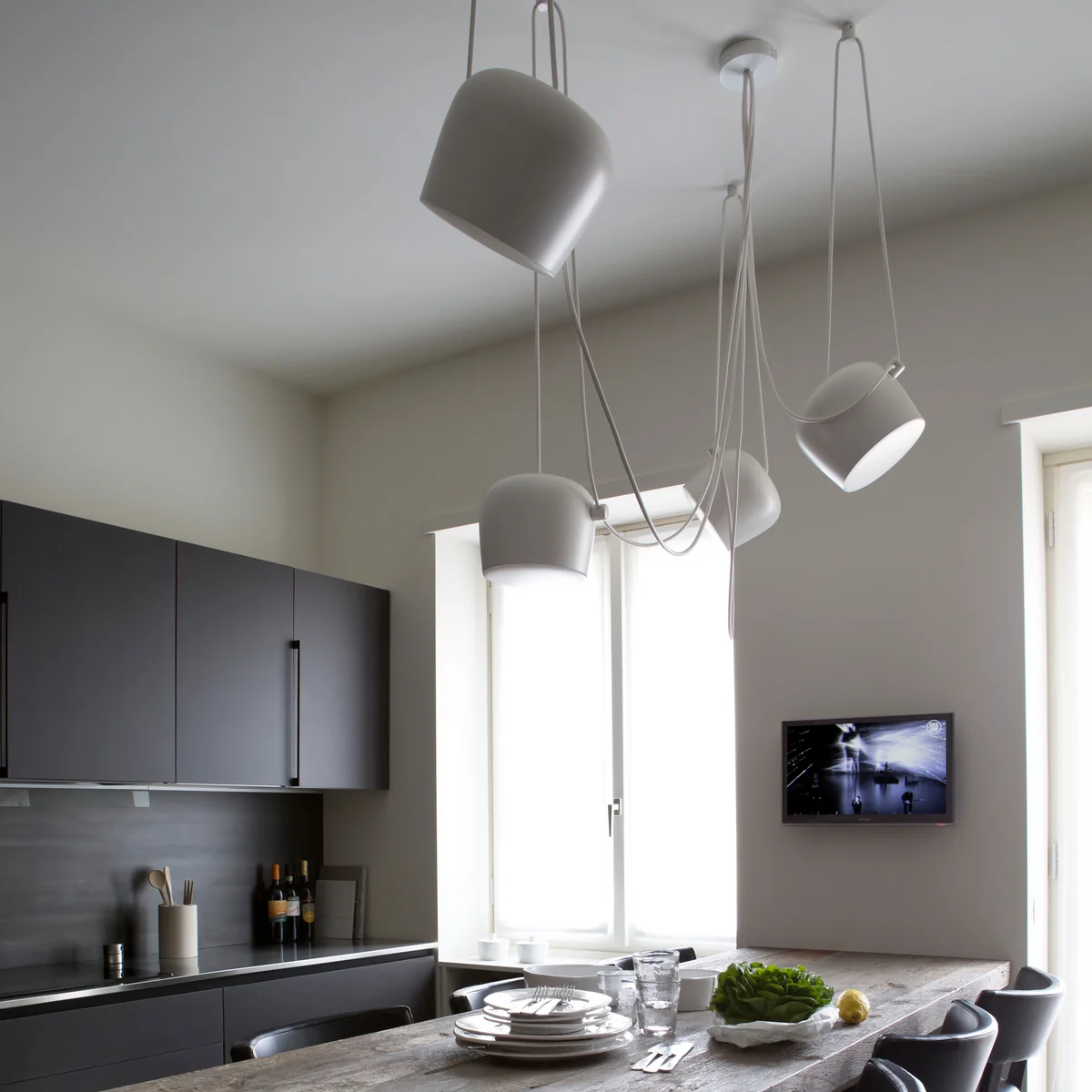 Der Leuchtenkopf der AIM LED-Pendelleuchte kann in beliebiger Höhe mit veränderbarer Schrägstellung angebracht werden - die völlige Freiheit lässt einzigartige Kombinationen zu. Die Installationen, die dabei entstehen, erinnern bereits mehr an Kunst als an Design. Das direkte, klare Licht der Flos-Leuchte eignet sich für Wohnräume und zur Beleuchtung einzelner Objekte.