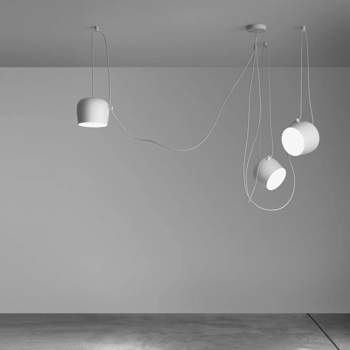 Der erste dieser Grundsätze ist die geometrische Mitte des Lichtpunkts: Leuchten sind meist zentral in Räumen aufgehängt. Bei der AIM Pendelleuchte spielt diese Vorgabe keine Rolle mehr, die Erdung erfolgt über lange Kabel. Als zweiten Grundsatz brechen die beiden Designer mit der Annahme, dass das Kabel reines Mittel zum Zweck ist und daher versteckt werden muss: Bei der AIM von Flos kann ein Kabelwald entstehen, mit ungestümen Linien und als ästhetische Funktion.