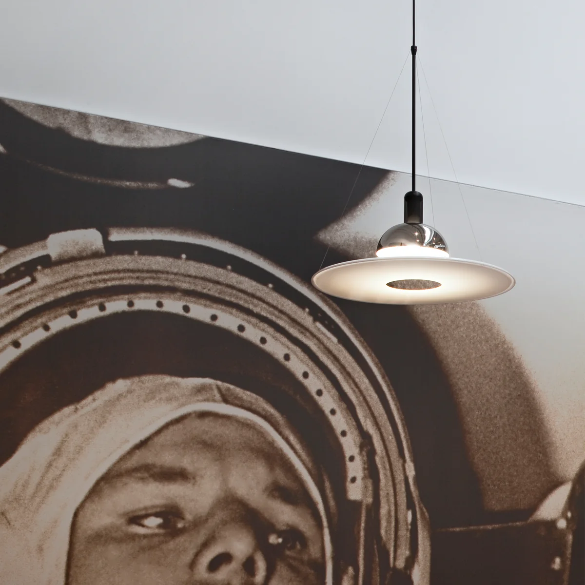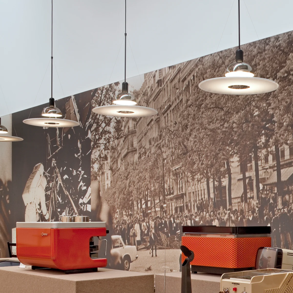 1978 von Achille Castiglion entworfen, kann die Frisbi Pendelleuchte heute gut in öffentlichen Räumen wie Restaurants und Galerien verwendet werden. Sie macht sich aber auch über dem Esstisch, der Kücheninsel oder im Wohnzimmer ausgezeichnet.