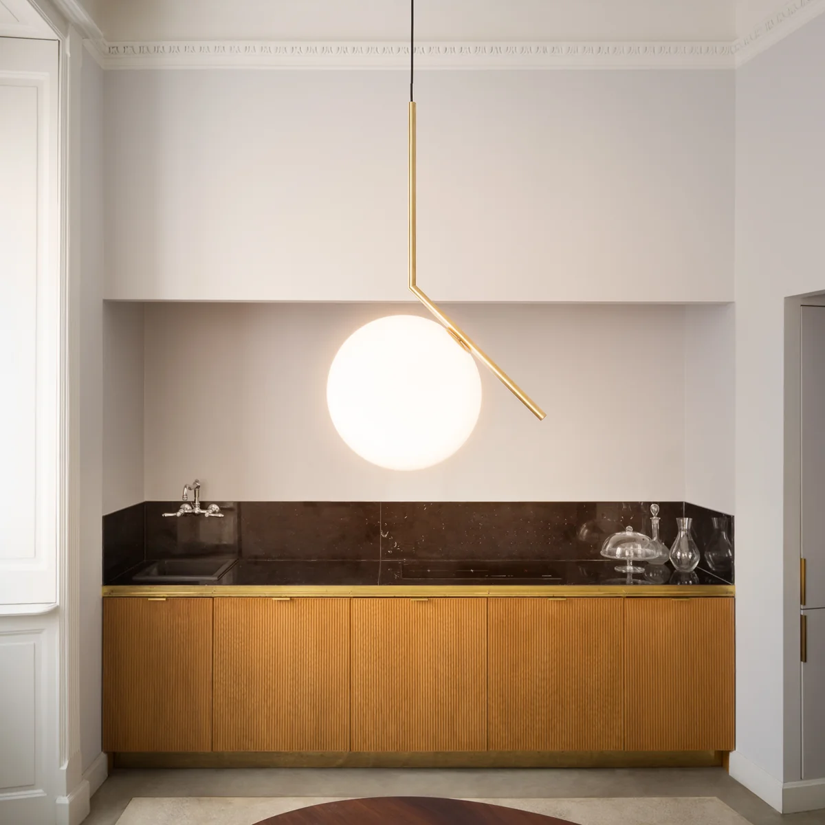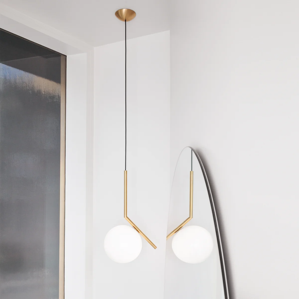 Der Kontrast aus filigranen Linien und voluminösen Leuchtkörpern, aus Metall und opalisiertem Glas, erzeugt bei der Flos IC Pendelleuchte einen ganz eigenen Charme. Das Material erinnert an vergangene Zeiten, während es formal in einen neuen Kontext gesetzt wird. Durch ihren matten Leuchtenkopf aus Opalglas fällt weiches und dimmbares Licht, das sich blendfrei im Raum verteilt und mit seiner behaglichen Art besonders für Wohnzimmer und Schlafzimmer eignet.