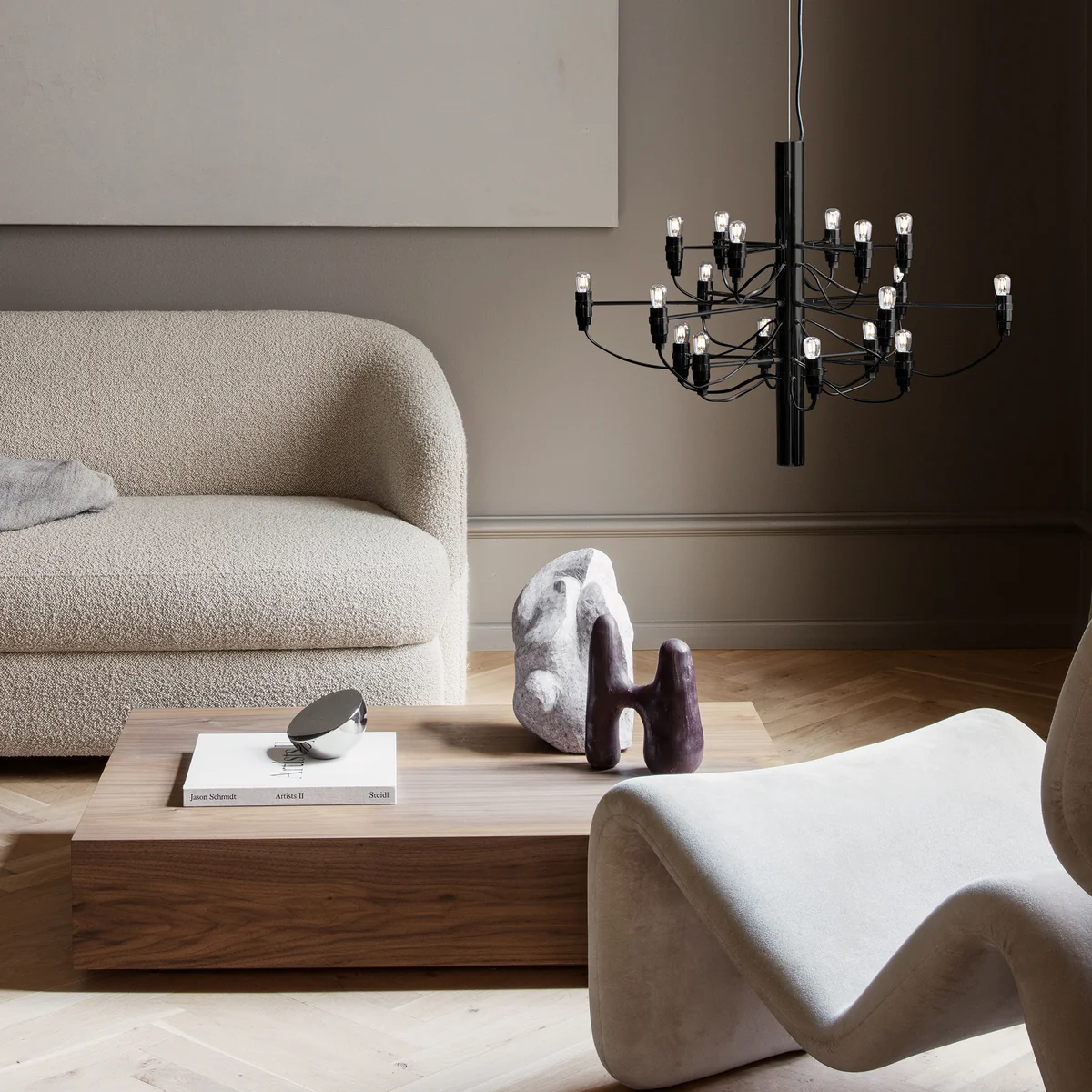 Die Glühbirnen befinden sich harmonisch verteilt auf den aus Stahl gearbeiteten Armen des Leuchters und tauchen jeden Raum in sanftes Licht. Anders als viele andere klassische Kronleuchter wirkt der 2097 modern und klassisch zugleich. Der Kronleuchter ist in verschiedenen Größen und Materialbehandlungen erhältlich.