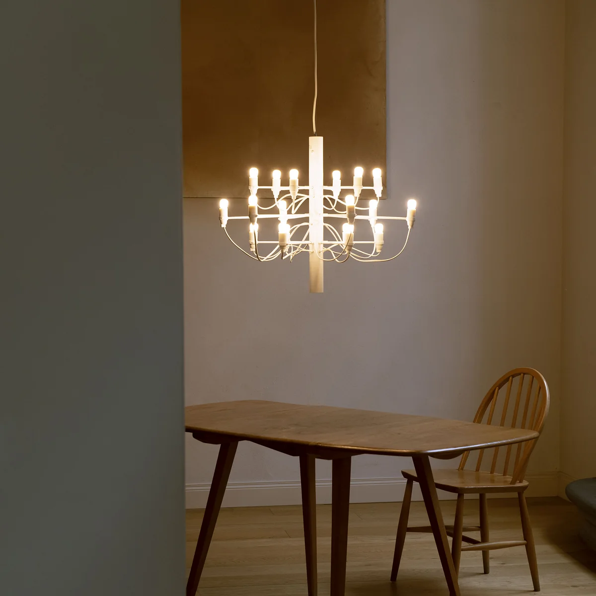 Der 2097 Kronleuchter wurde bereits 1958 von Gino Sarfatti entworfen und ist eine moderne Interpretation des klassischen Kronleuchters. Ein Stahlrohr in der Mitte verbirgt die von den Glühbirnen ausgehenden Stromkabel, die für das schwungvolle und dennoch schlichte Design sorgen.