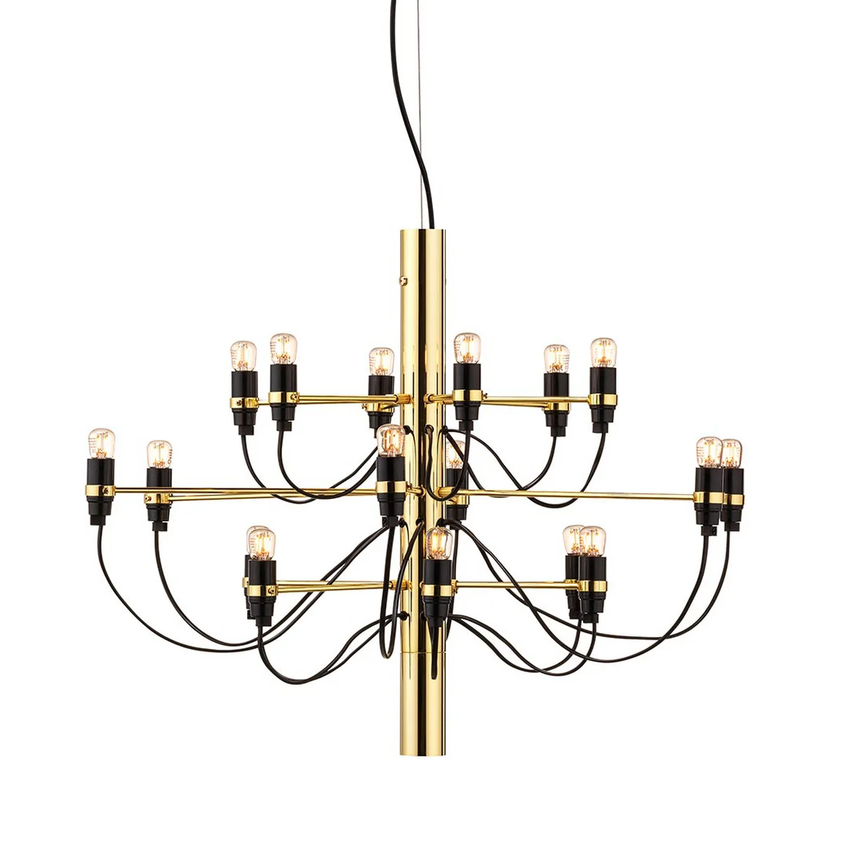Der 2097 Kronleuchter wurde bereits 1958 von Gino Sarfatti entworfen und ist eine moderne Interpretation des klassischen Kronleuchters. Ein Stahlrohr in der Mitte verbirgt die von den Glühbirnen ausgehenden Stromkabel, die für das schwungvolle und dennoch schlichte Design sorgen.