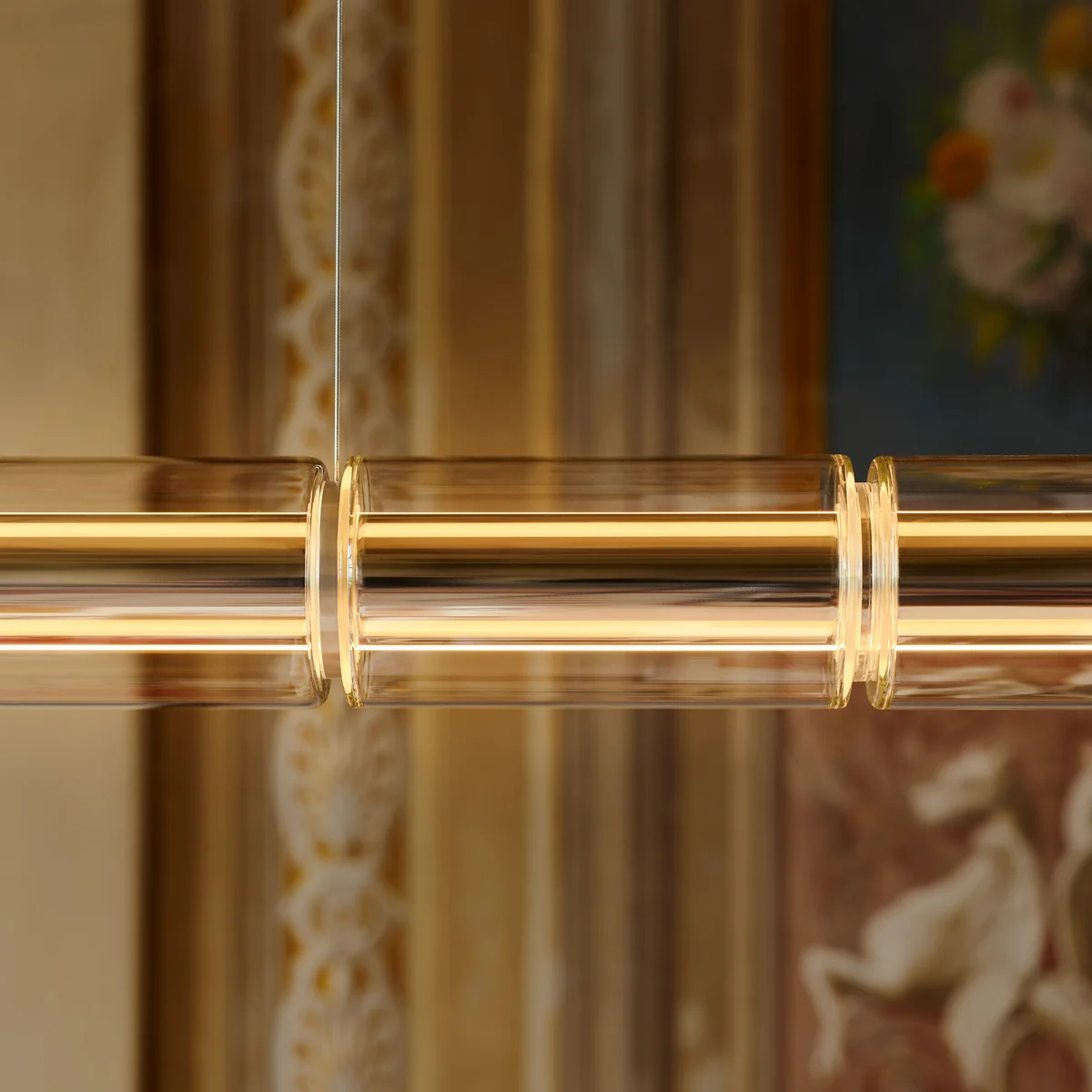 Umschlossen wird das Profil von einer Abfolge zylindrischer Borosilikatgläser, die durch feine Distanzstücke rhythmisch getrennt sind und dem Lichtkörper eine skulpturale Leichtigkeit verleihen. Ob einzeln oder in parallelen Reihen arrangiert – Luce Cilindrica entfaltet in jedem Raum eine ruhige, architektonische Präsenz.
